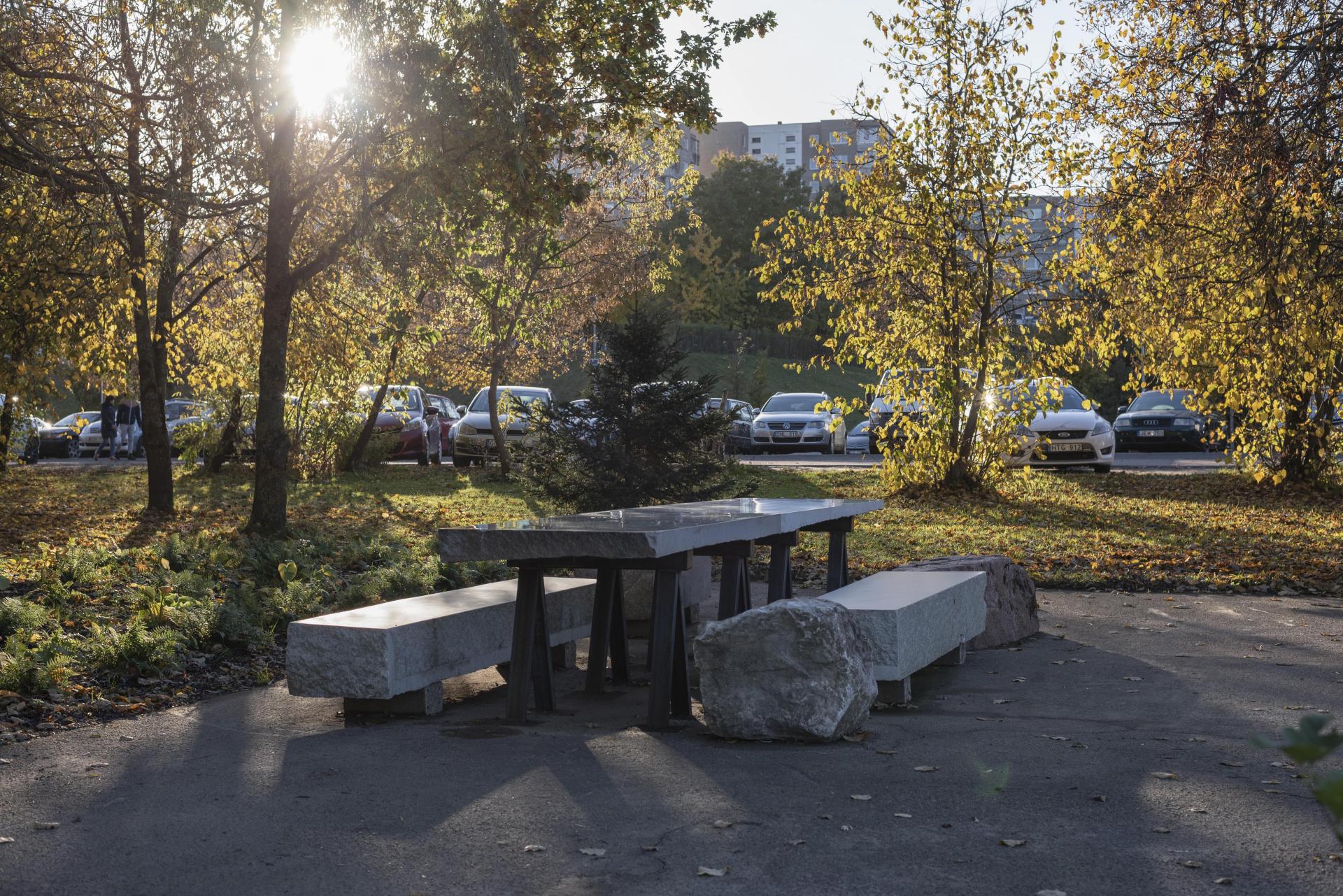 Not long ago, before the urban expansion of Vilnius in the late 80s, Fabijoniskes district was still a village composed of clusters of individual houses, agricultural and wild lands. This was a huge inspiration for us when claiming an abandoned asphalt area and conceiving a new public space typology - an outdoor living room. It was important for us to make the space design inclusive from the very start, therefore, we organised workshops with neighbours and local authorities before, during, and after the project. Together, we have not only replaced an abandoned asphalt area with garden swathes and placed uniquely crafted stone furniture pieces shaping a zone for public grilling and leisure but started a focal point for collective communication.