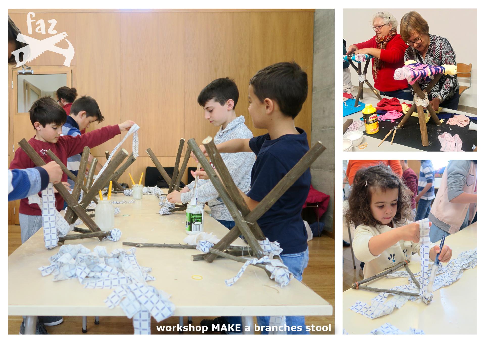 Workshops for institutions are usually designed according to needs, facilities, public and/or available materials. An example is the workshop MAKE a branches stool (image 1), designed for Associação Casa d'Árvore - ABCNatur for a large group of unaccompanied children and low resources, so only scissors and a brush were used and the materials was invasive acacias from their backyard and old cotton fabric. Later this workshop was also held with some adaptations for the Portuguese Red Cross - Côa (see 2º PDF) for a group of elderly people. Because it is suitable for a large number of participants, not having tools available for them all and low resources. The size of the bench was adapted and a handcrafted stuffing made from used clothes collected by the institution.
