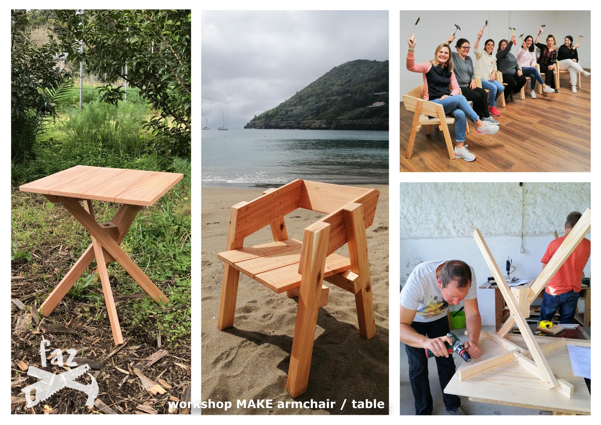 FAZ is not just a set of easy to do furniture models, are workshops for beginners. A participatory learning model creates an immersive experience of how easy, fast and gratifying this handwork is. Participants experience how feasible these furniture pieces are to make. The design takes into account the difficulty and time of each operation, as well as the motor skills of the participants. These are designed to be enjoyed to build. Each piece takes between 30 minutes, in the case of the stool, to 6 hours, like the armchair, to be made. Techniques in use are easy and fast learning curve, therefore you feel instant gratification by the immediate results of having a ready to use piece of furniture. Furthermore, the gratification of doing something with our own hands increases self-esteem.