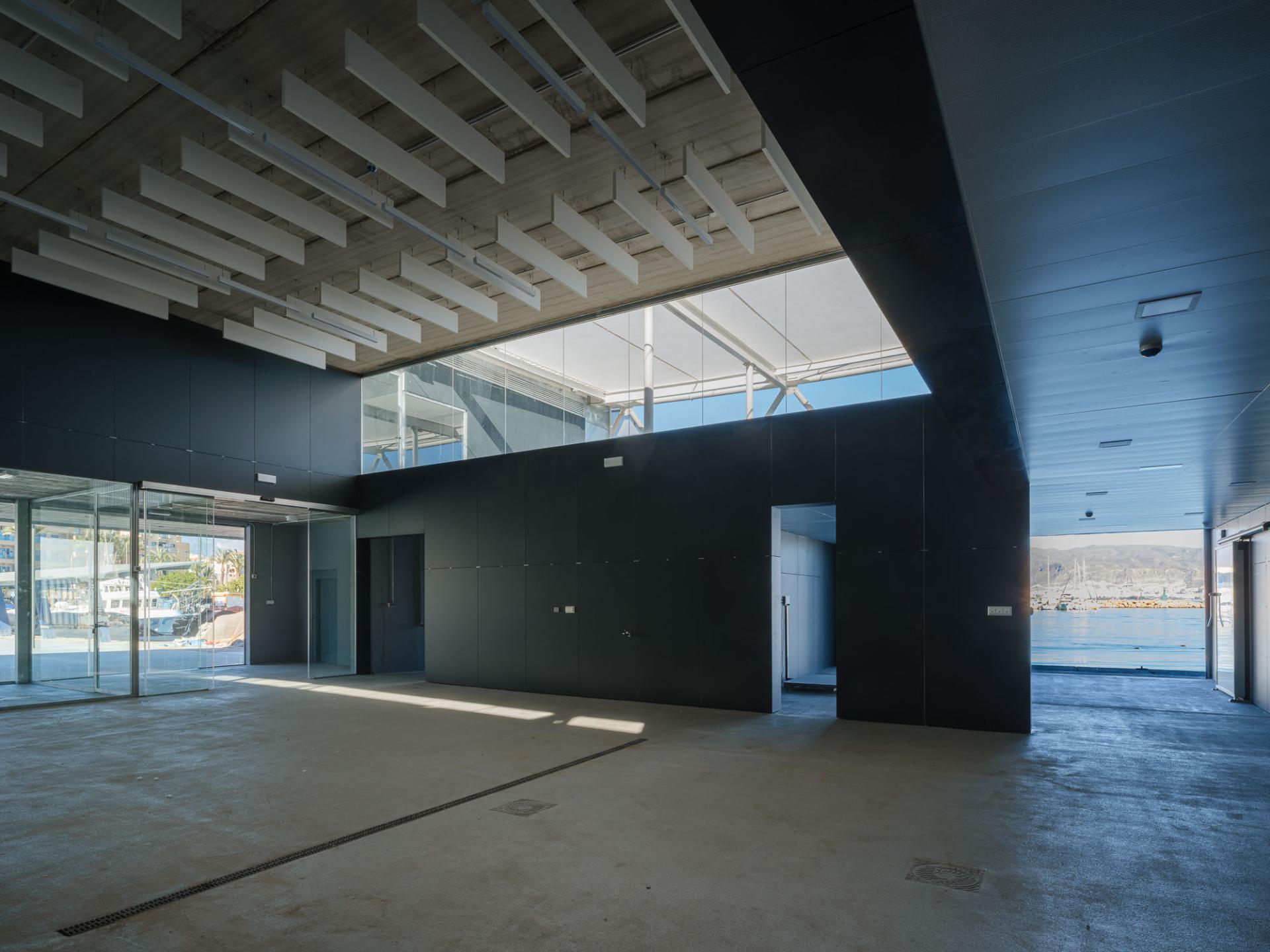 The rest of the upper floor is covered with white perforated PVC sheeting, which filters the light and allows ventilation, making this space destined for the restaurant terrace a very pleasant place that enjoys the privilege of the views of the Port and the Sierra de Gádor mountains as a backdrop, protected from the sun and cooled by the cross ventilation and the freshness of the air that rises from the sheet of water and penetrates the terrace. The terrace itself collects all the rainwater that passes through the perforations in the sheet. Grey micro-perforated PVC is used for the rest of the façades.