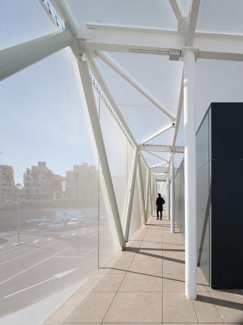 Its open condition to the city starts in a large covered porch to the west, in which a glass exposes the fish market and allows to contemplate from the outside the claim of the auction courtyard. The second floor is a unitary space like a greenhouse under whose textile envelope unfolds an interior landscape of small volumes that enclose restricted uses: kitchen, offices, toilets, facilities, warehouses... The visitor circulates between them to contemplate the work of auctions and handling, as well as to access the cafeteria and its privileged terrace.