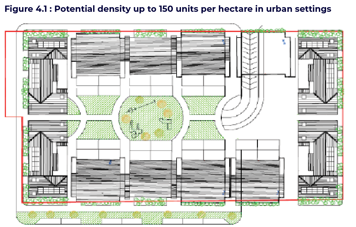 The three-storey aesthetic would be relevant in both urban and rural areas. Traditional one-off homes in rural areas could be planned as a small community of homes to share transport and land resources. One cultural benefit is that higher densities of between 35 to 100 dwellings per hectare can be maintained over a lifetime to help support public services. Local project architects could adapt the aesthetics to the location.
