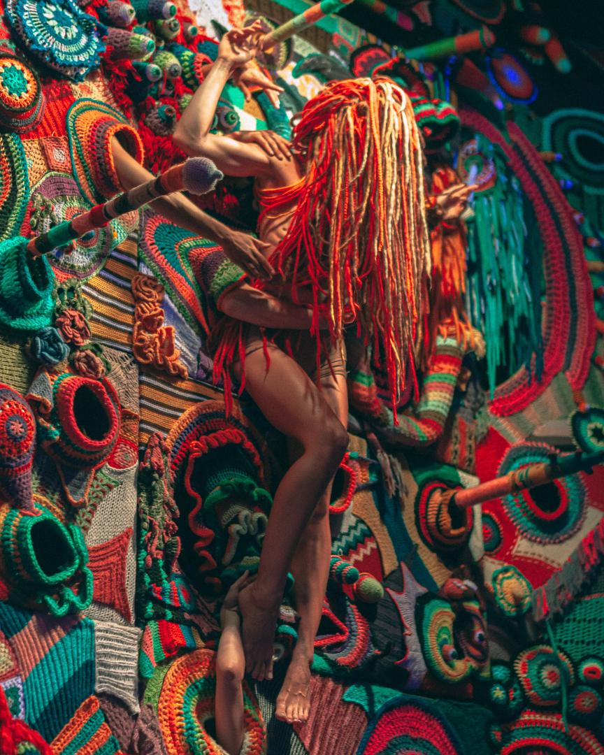 The response from the audience was very positive and also emotional. This was particularly evident in the enthusiastic audience reaction to the very young dancers of Compagnie Dumanlé from Abidjan, who performed their piece Sacred Forest on a six-metre-high circus rig on the forecourt of the Schauspielhaus, telling the story of an endangered sacred forest through urban dance, circus and acrobatics. The beauty of the forest and the important role it plays in our lives were also at the centre of another piece, the audio walk through the Barmer Wald :hearing the unknown by studio s:o:m. The festival’s opening performance by Michèle Noiret from Belgium combined dance and film to celebrate the fragility and peculiarity of insects. The giant crocheted coral reef in the production Organismo, by company Maraña and choreographer Paula Riquelme Orbenes, delighted audience members of all generations. The Afro-futurist production PL3MONS by the young Belgian company around Younes van der Broeck and Ramos Sama featured parasitic extraterrestrial creatures that take over our world in the future and find a host in plastic to wreak havoc and destruction on Earth. In Kolochi Baw, the Pina Bausch Fellow Aïda Colmenero Dïaz and the Cameroonian bio-architect Angel Fulla reflected on the Djenné Mosque in Mali.