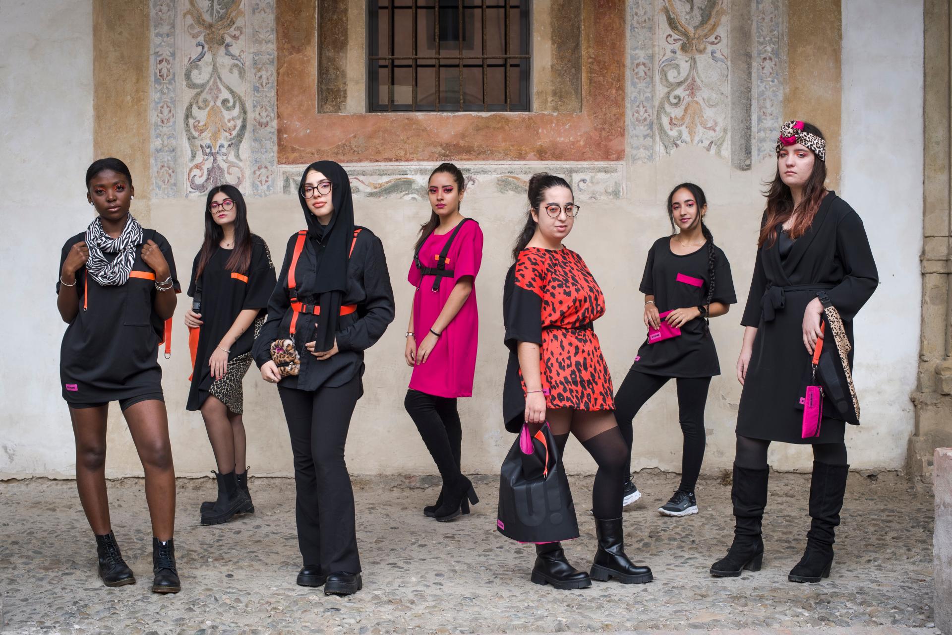 The program started with two workshops led by an anthropologist and a researcher that explored the themes of body, sexuality and focused on creating collective means in transfeminist language. Books from feminist literature were then selected in collaboration with Patto per la Lettura di Bologna - a literature-based network promoting reading in all forms - to help the girls choose the six words to inspire the streetwear collection's concept and design. Later, a professional fashion designer expertly guided the girls through the creation of the clothing line. The garments are manufactured by women inmates in the female section of the Dozza Prison, thanks to a partnership with the Gomito a Gomito cooperative. Nothing was purchased to produce the SCIAME streetwear collection, each piece is rigorously created from the surplus stock of fashion companies in the area that donate fabrics that would otherwise be destroyed. The pieces of the collection are for sale on the Gomito a Gomito shop, to which the profits will go, and they will all be limited edition and made to order. The SCIAME artwork also includes a comic that captured the participants’ experiences and aspirations. The comic was created by a young artist and published locally by Canicola Edizioni.