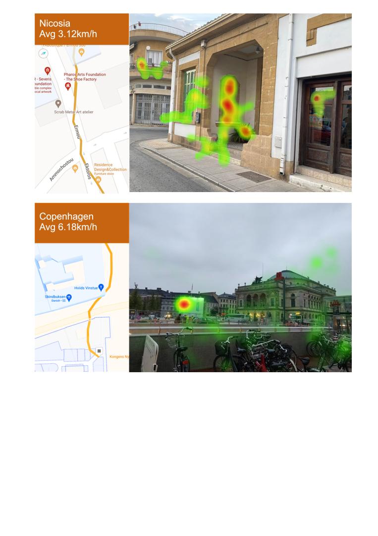 This project was open to all. It was not just for a specific group or society. Therefore, citizens who used and lived in the city of experiments could participate. Through an open invitation, they were invited to the starting point of the experimental path, navigated the selected urban path, and answered the questionnaire about it at the end. During the navigation, the participants were familiarized with various forms of sensing recording. Their measurements, conscious (questionnaire, marked stimuli in 3D visualization - video) and unconscious (heart rate, navigation rate, points of interest, points of change of direction, points of stress expression), were disclosed to each participant at the end of the experiment. Explaining their results helped them understand their fixation points in the urban environment in which they live, explaining why others caused them discomfort. FUMapp's experimental process and the vocabulary it created helped participants better understand their environment and increase urban movements. This contributed to more intense daily commutes to cities, more time outside private property, and the development of a neighborhood micro-economy that benefited the growth of all small businesses. The increase in pedestrian traffic in the survey areas gave the society metrics about the health of its population. More specifically, in Nicosia, measurements were given to a group of psychologists investigating the impact of the green line on health, while in Athens, the heart measurements of the participants were presented to the Athens Medical Association. In combination with the materiality of the ground during navigation, a team of doctors is now investigating the relationship of tactile navigation surfaces with orthopedic and cardiovascular problems. So, the importance of the FUMapp does not only concern the modification of the design result but also its impact on other areas, such as health, which is directly linked to sustainable design.