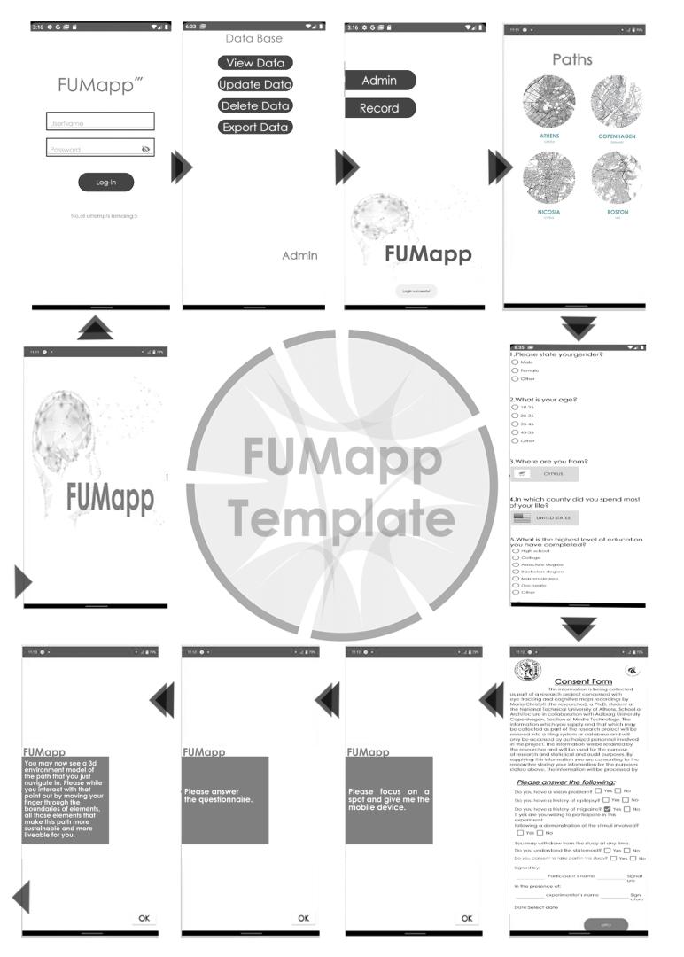After an in-depth literature search, the FUMapp spatial tool was designed. The study was designed to capture the optical response of the participants in the specified public spaces. It aimed at tracking participants' eye movement in the presence of specific architectural challenges in the urban environment. The experiment used two settings: the "real" environment and the identical "virtual" clone. The real environment was a short walk of about 1 km through a specific street at the center of four cities. This walking path was familiar to the participants. The virtual environment was a 3D video map that was accessed with the aid of a mobile phone application. Like in Arbib (2015), the real environment was selected suitably to determine the features of the embodied virtual environment.