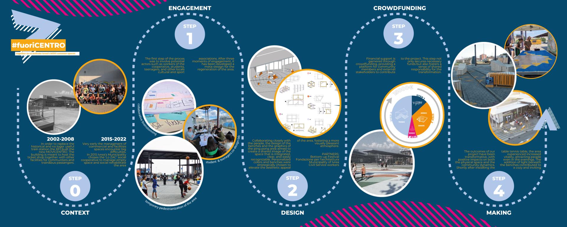 FuoriCENTRO is an urban acupuncture project that aims to transform the outdoor area of Ivrea’s Movicentro. Movicentros are structures quite common in Italy, serving as transportation hubs where people can commute and switch between cars, trains, and buses. They are typically located on the outskirts of urban centers, often perceived as unsafe places. In 2015, the cooperative Zac took over the management, introducing a small shop featuring local products, a study room, a space for private meetings, and a bar. Thanks to these additions, the place has improved and now attracts people for lunch breaks or afternoon studying. Additionally, they offer an extensive program of cultural events, ranging from book presentations to music concerts. But the outdoor area is currently an empty parking lot, lacking identity and failing to encourage people to stay. FuoriCENTRO, aims to change this. The first phase involved engaging users, particularly young people who traverse the space to reach their schools, in imagining how the space could be in the future. We conducted two sessions: one where we asked them to envision the space, and another where we occupied the area and the street for a day, experimenting with various activities such as book reading, a collective lunch, basketball, skateboarding, and tennis table. In the second phase, based on the suggestions from the first phase, we developed a project that responded to the users' needs: more space for play and sports, a comfortable and welcoming area to wait for buses. We organized a crowdfunding campaign to make the transformation of the area a reality. In the third and final phase, working within the budget we attained, we adjusted our project to align with both the expectations and the funding we had. The result is a collective area featuring a communal table tennis setup with a box for shared bats and balls, and a relaxation area with benches that we built in collaboration with users and a group of architecture students.