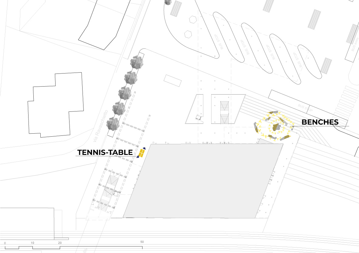 Collaborating closely with the people, the design of the benches and the graphics of the ping pong area aimed to create a shared image of the space that is integrated, clear, and easily recognizable. Personalized colors and benches were strategically chosen to elevate the aesthetic appeal of the area, fostering a more visually pleasant atmosphere.