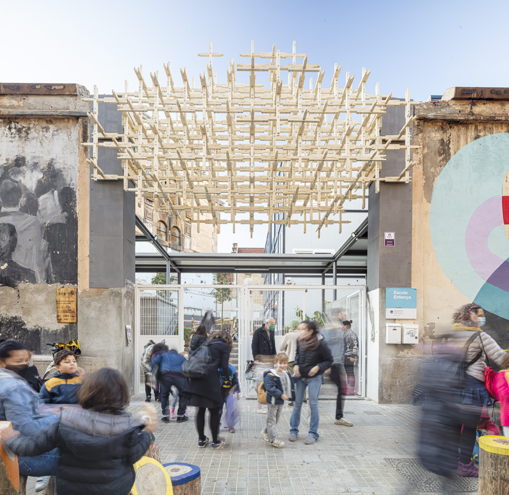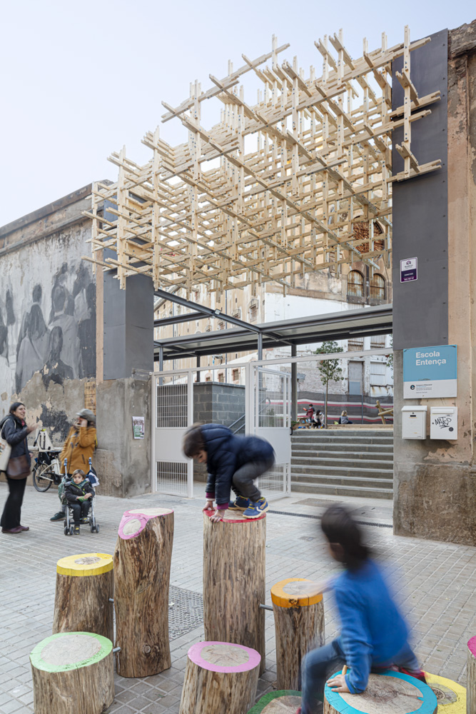 In the case of NEW NIU design the main challenge was to bring lessons from the forest context of Valldaura Labs and the Collserola Natural Park to the urban environment, specifically the entryway to Escola Entença. Taking materials from the forest and processing them using advanced digital computation and traditional carpentry methods, designers were to create an interactive playscape that represented the forest ecology to inspire the students, and provided multi-use functionality for the whole community.
