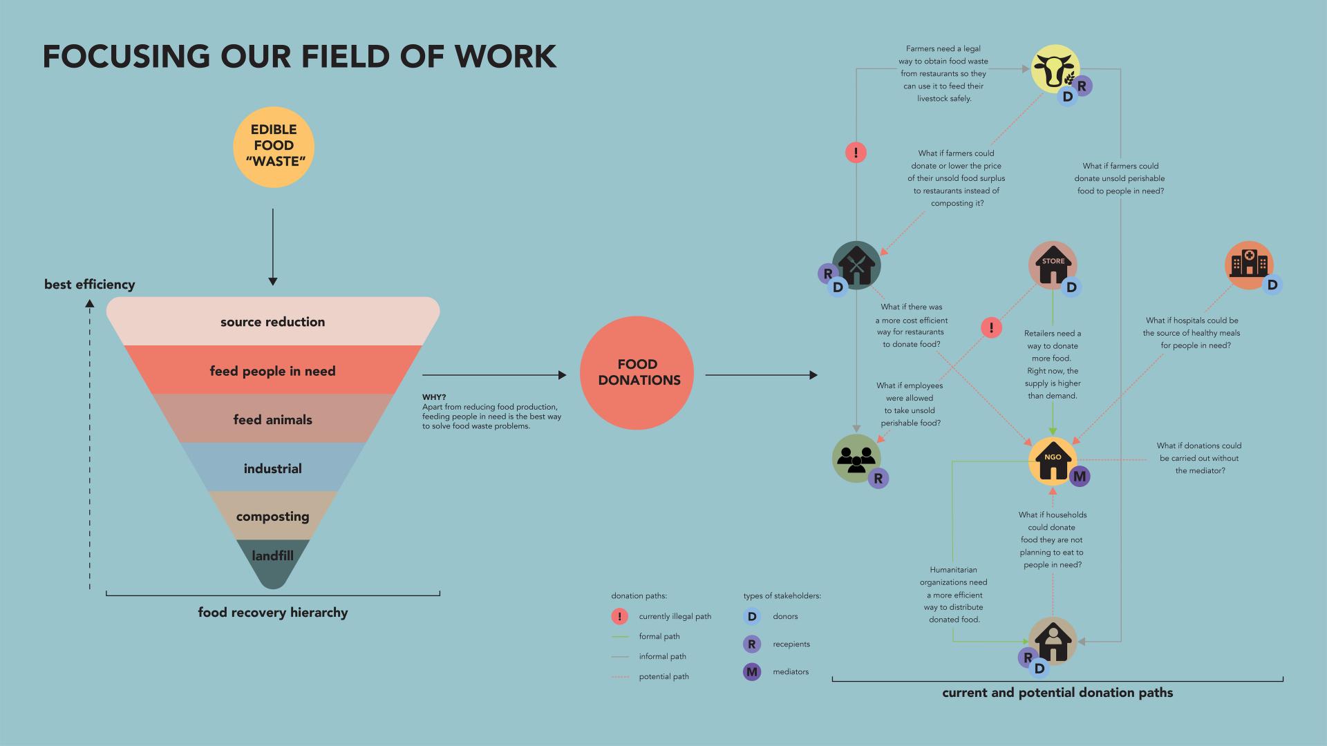 After the initial exploratory research of the topic, the main objectives of the project manifested as the following research question: “How might we better utilise edible food waste generated in the second half of the supply chain by systemically optimising food donations?”. This not only unveiled the environmental and economic aspects of food waste itself but also uncovered the social aspects of marginal groups with lower incomes.