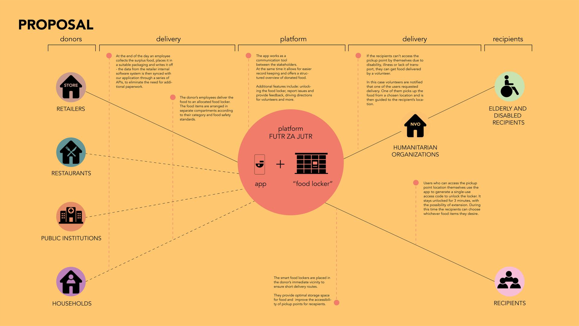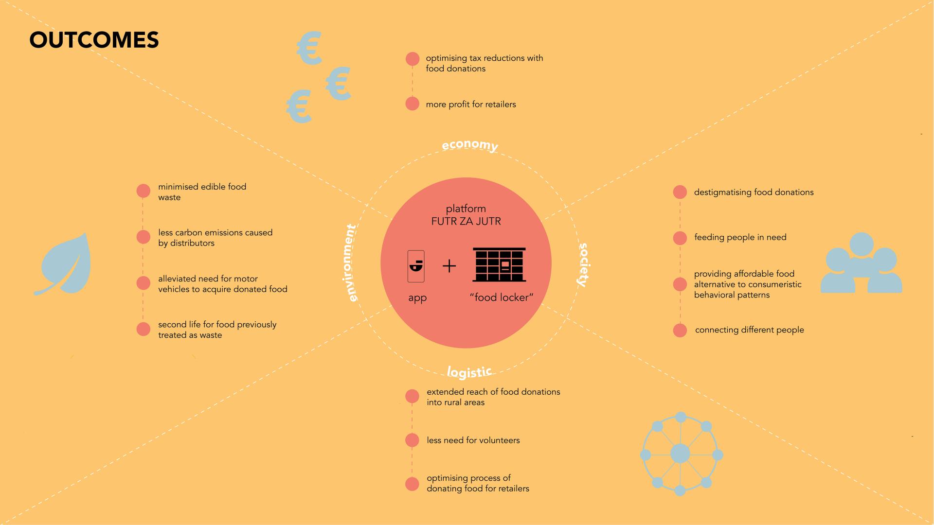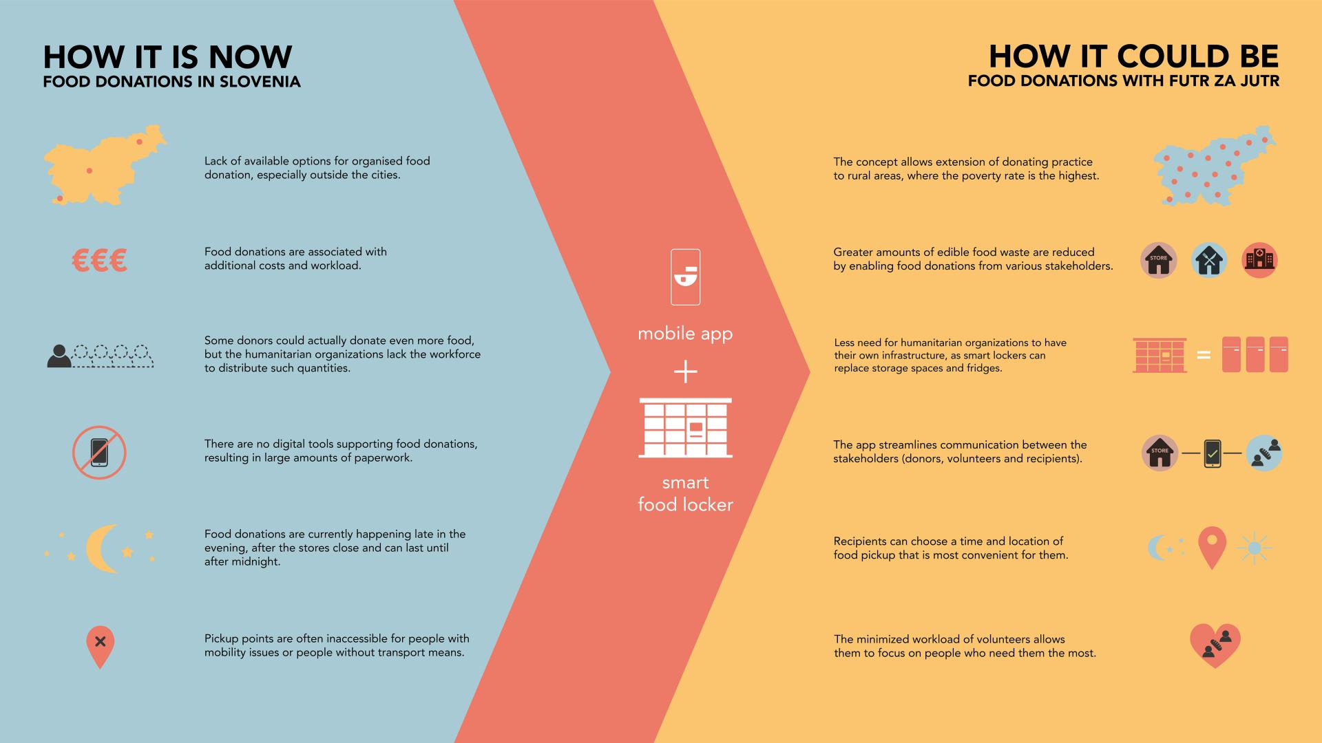 FUTR za JUTR reforms currently established processes of food donations in Slovenia in order to reduce edible food waste and fight hunger efficiently. A combination of an app and a smart food locker streamlines the communication between the stakeholders, makes pickup points more accessible for users and decreases the volunteers’ workload. By introducing a self-service pickup point model food donations do not depend solely on volunteers and can be expanded to other areas outside the cities.