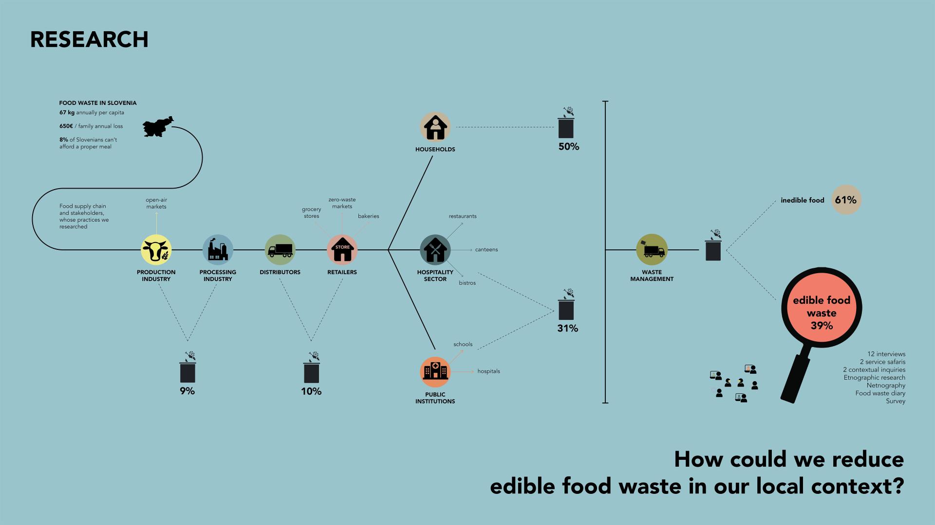 As food waste is part of a complex systemic issue, we gathered insights from various stakeholders as holistically as possible and focused on uncovering the needs and habits of various people involved. To make sure our research was as thorough as possible we triangulated multiple research methods, such as stakeholder mapping, expert and user interviews, service safari, surveys, etc. On the local level, we cooperated with farmers, distributors, retailers, grocery store employees, restaurant owners, volunteers, and hospital kitchen staff from the central region of Slovenia. On the regional level, we compared the practices of various NGOs and their workflow, and on the national level, we collaborated with the Ministry of Agriculture, Forestry and Food, and the Ministry of Environment and Spatial Planning.