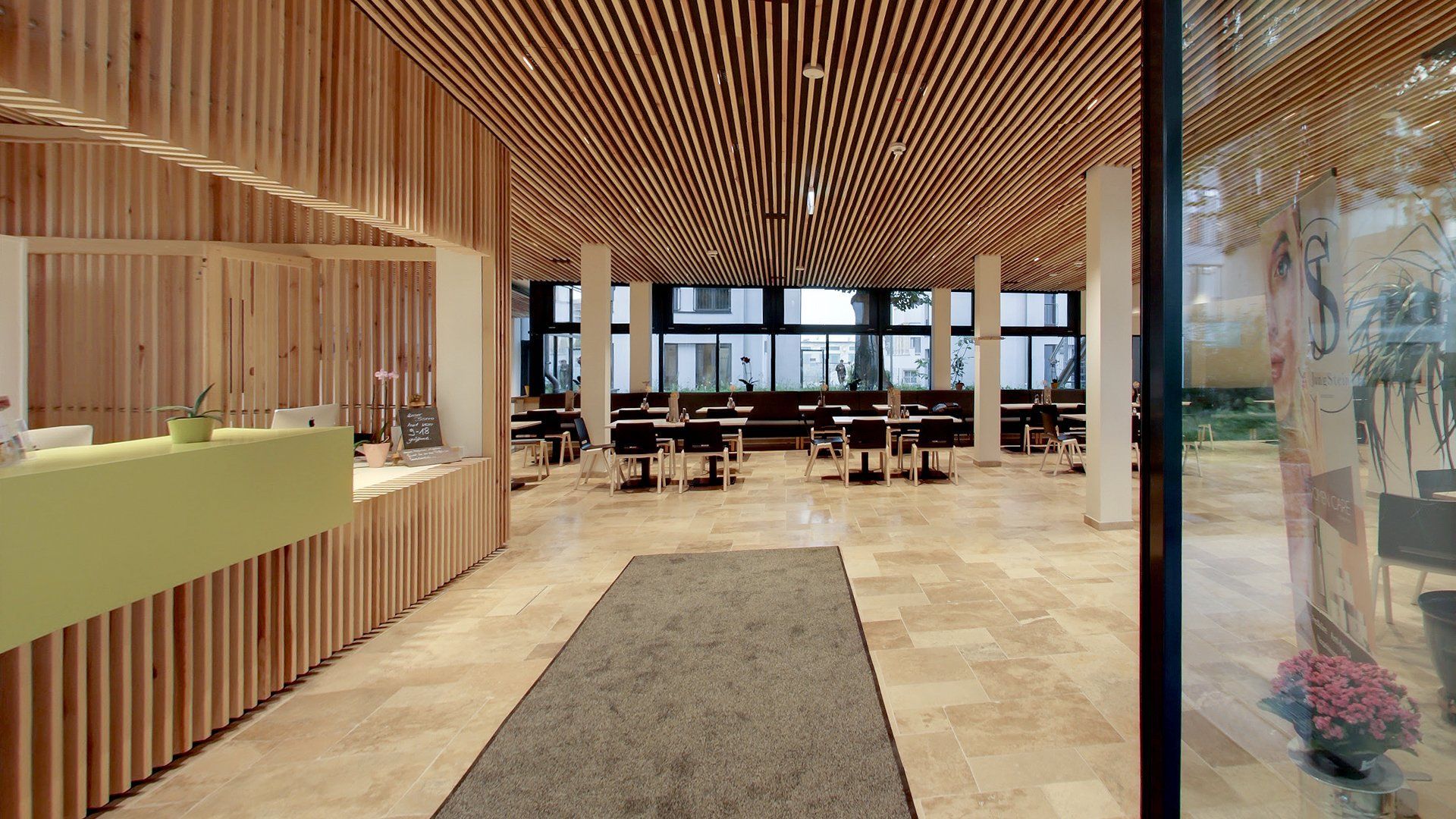 The decision to use the timber construction method (and not the conventional reinforced concrete) was made very consciously. The technical, structural sustainability results from the timber construction method, which saves and binds CO2. Only the high degree of prefabrication and the timber hybrid construction (e.g. of the wall-ceiling elements, ceilings) can save truck trips and shorten the construction time. Wooden construction also improves the living climate itself, so it has a positive effect on the human physiological level.