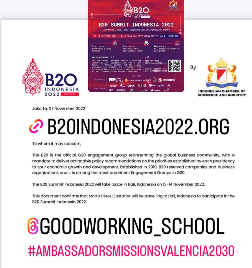 Goodworking school has been called as a delegate in the G20 B20 Indonesia, Bali