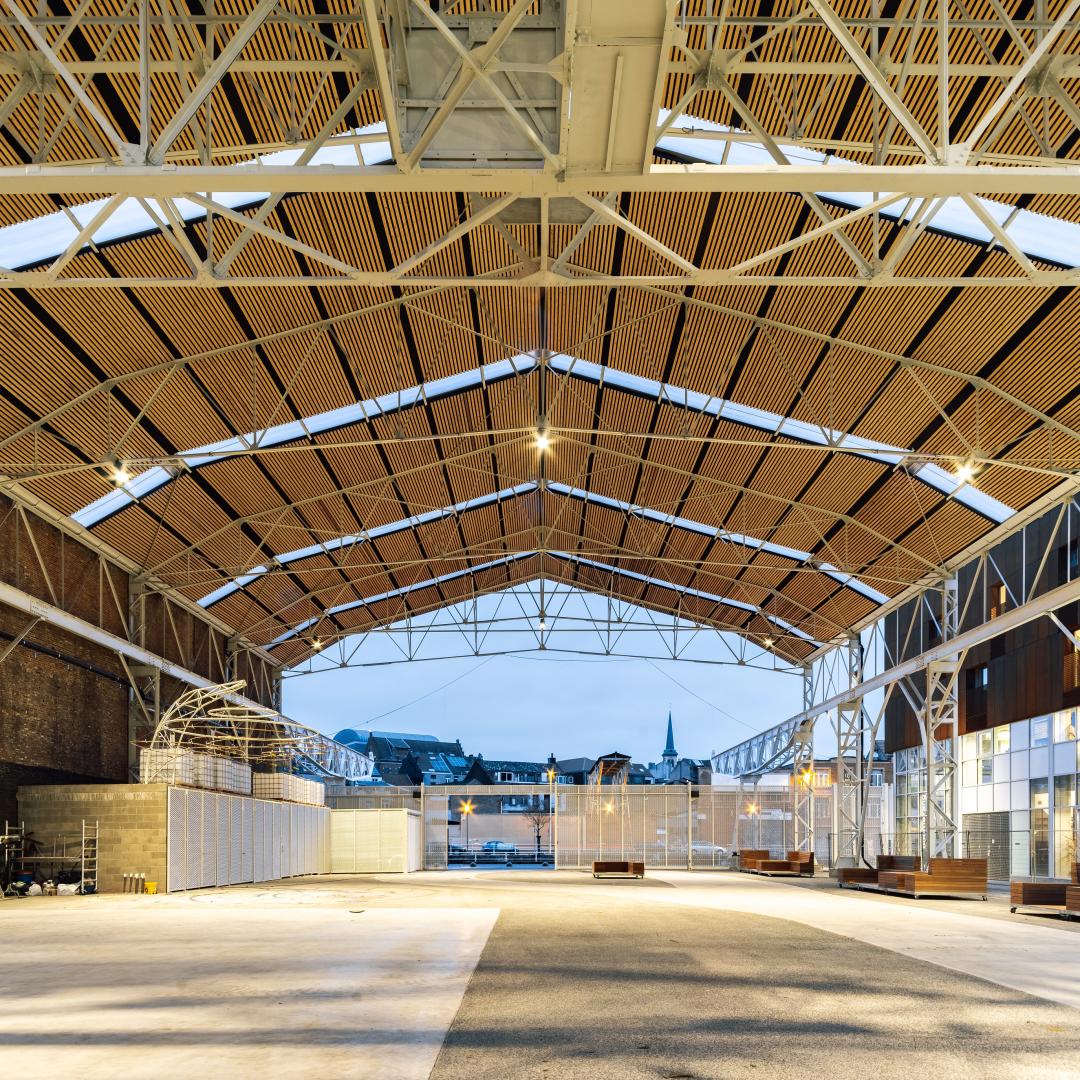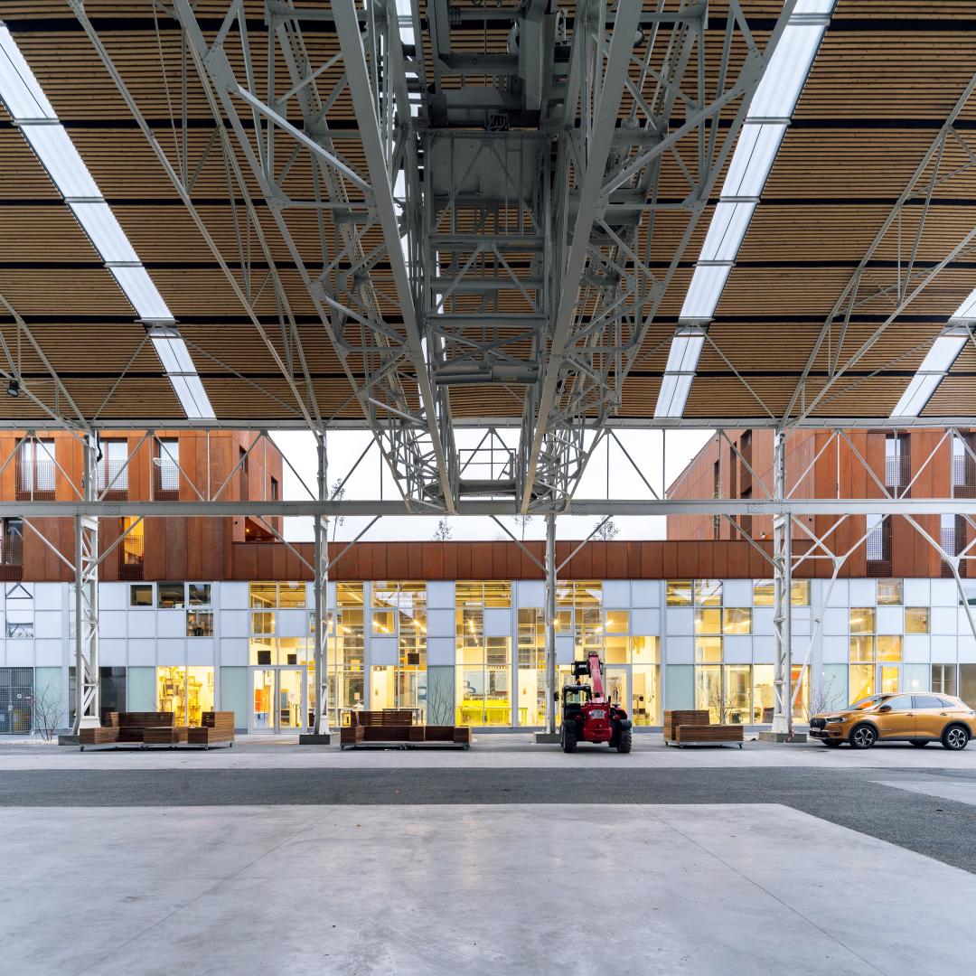 Transforming a lost industrial patrimonium into a welcoming and secured covered public space. The elegance of the existing structure has been reinforced by contrast through new housings and facilities constructions proposing material dialog with the existing steel structure.