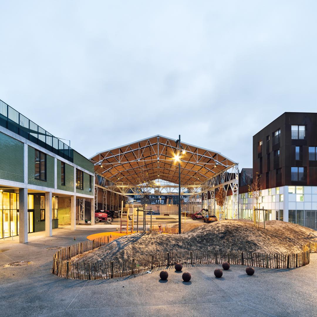 A Circus School will comme later in one of the existing factory buildings and will be connected to the covered public space.