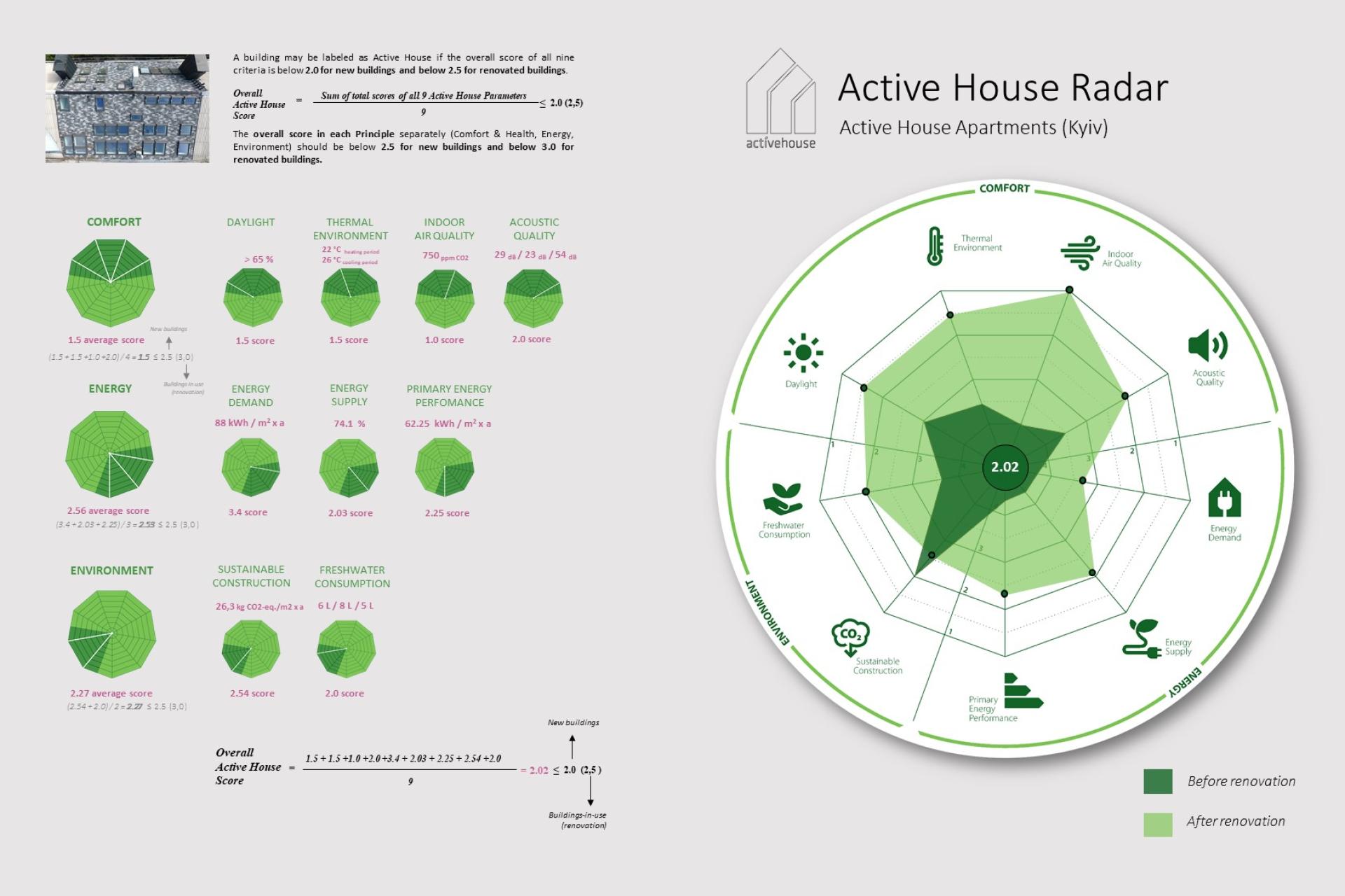- balance of 9 criteria in 3 Active House principles: Comfort, Energy, Impact on the Environment