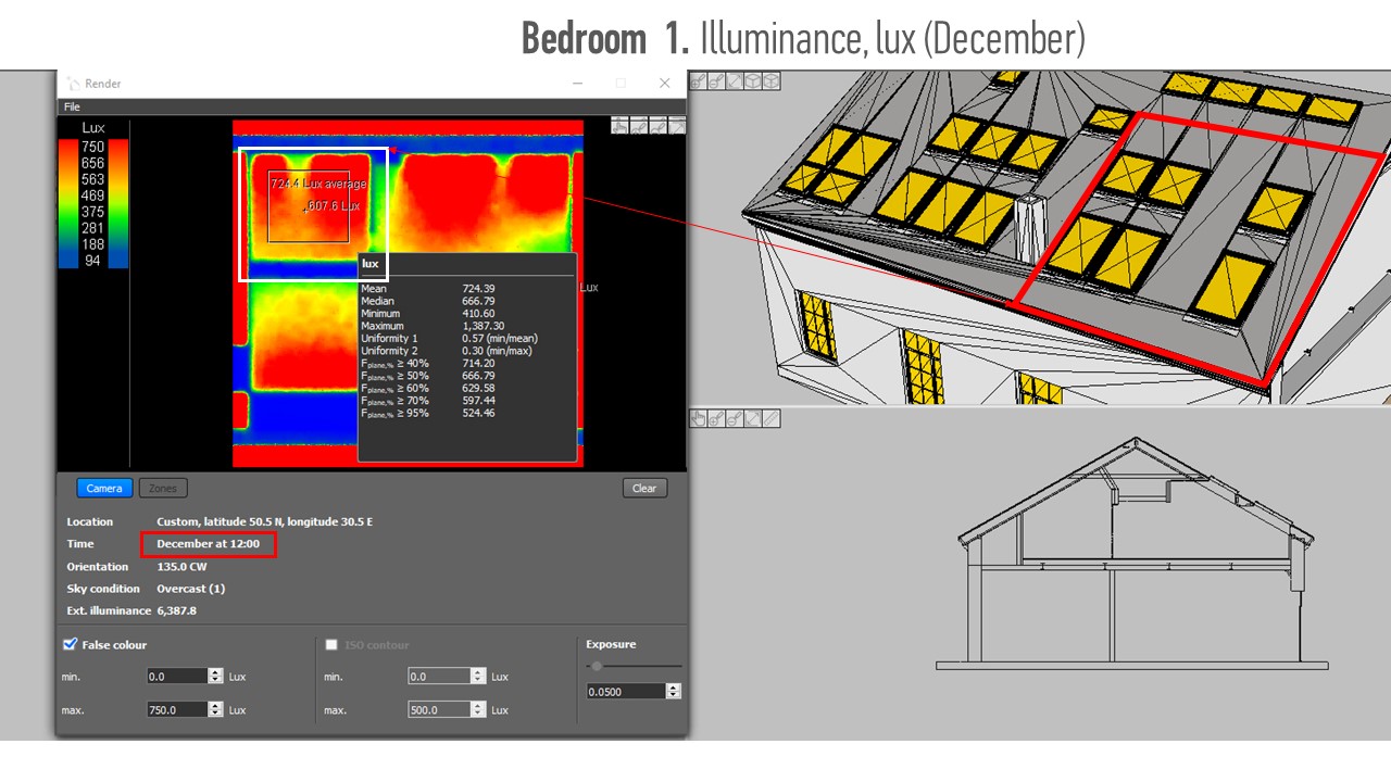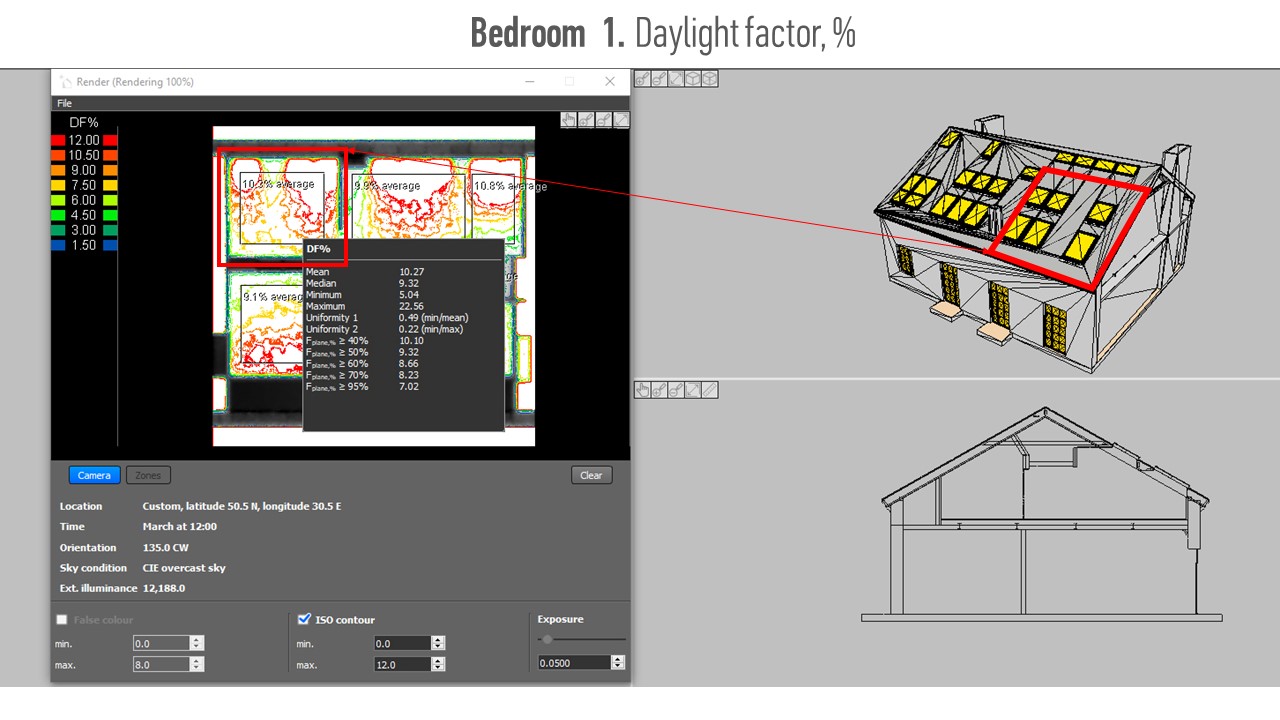 Daylight was carefully calculated by verified software and confirmed by real measurements. More than 70 % of living rooms has an access to the daylight illuminance more than 300 lux.