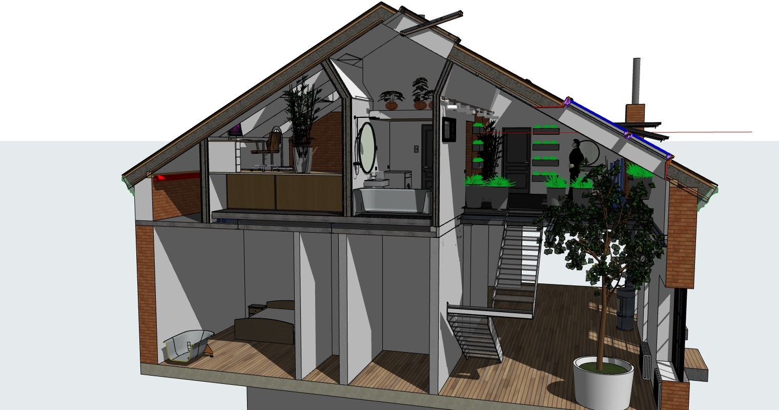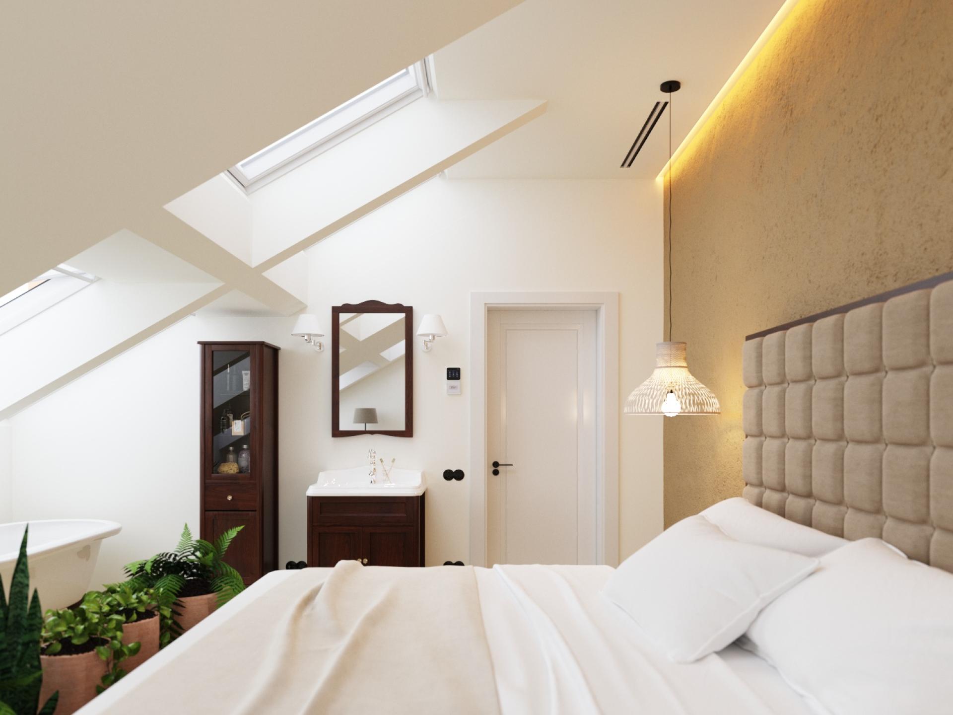 The project follows the local building codes and save the shape of the roof as it was before. It means, that the attic is fully integrated in the initial environment.
