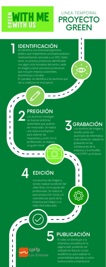 The Green Project is a project implemented using a project-based methodology. The project is integrated in CPIFP Los Enlaces as a "center project" and is led by a group of teachers from different specialties at the center, who identify the good practices to be studied each year and the companies in the area. Since the teachers are from different specialties, each one can indicate the problems that may arise and the personal, budget or materials that are needed for implementation.