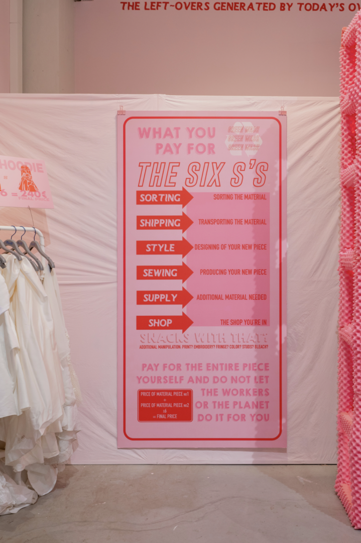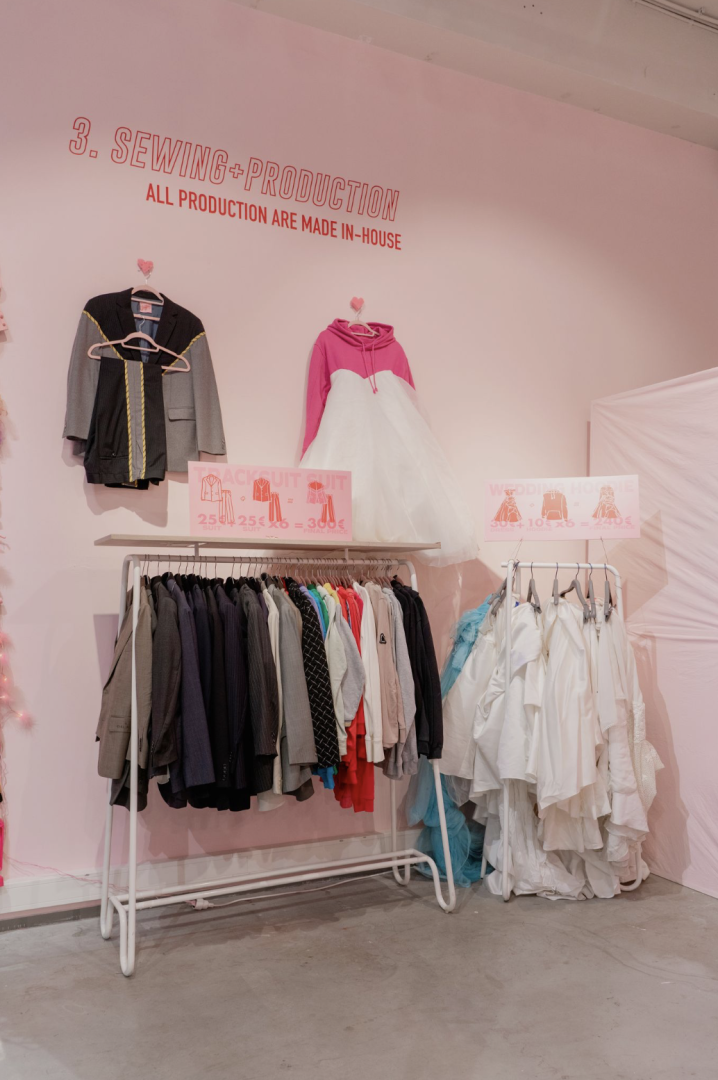 When happy with the result the pieces were sent into The SWEAT SHOP for production. At this visible atelier, our team of skilled sewers and tailors produce the custom pieces in full view to fully portray the labor and skills needed behind your new-from-old showpiece of fashion.