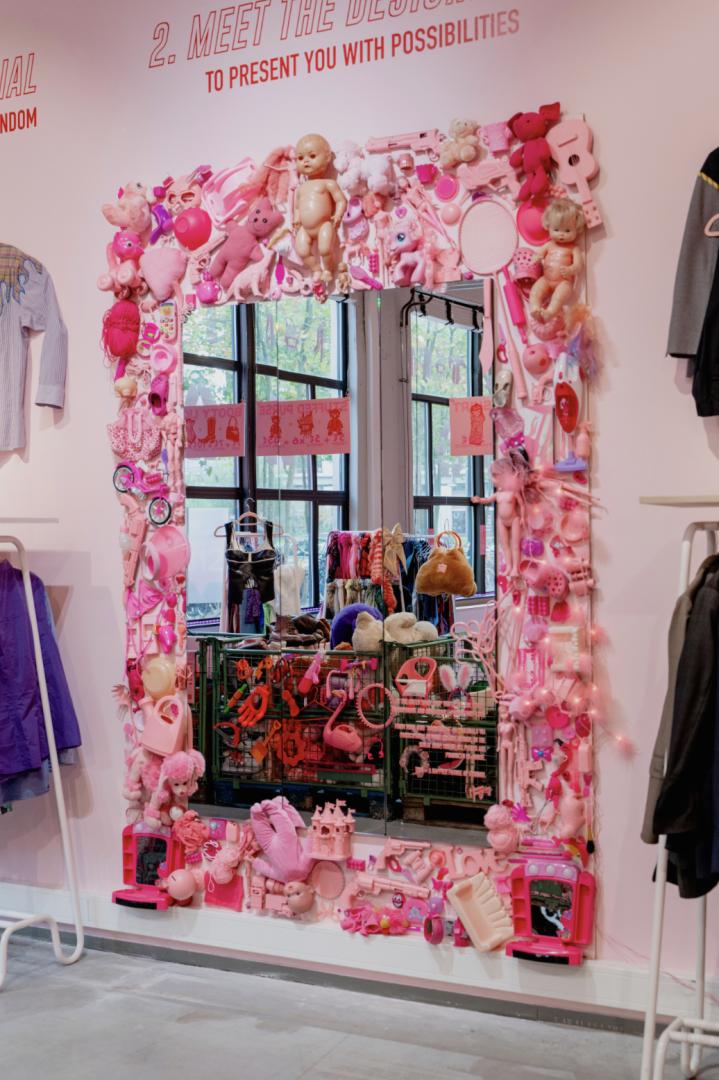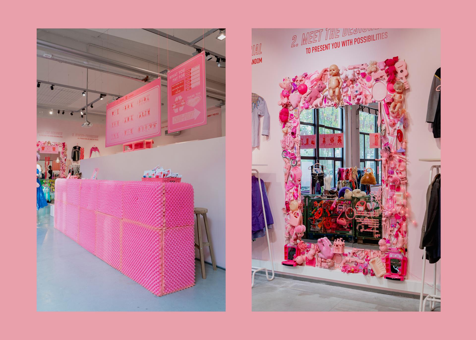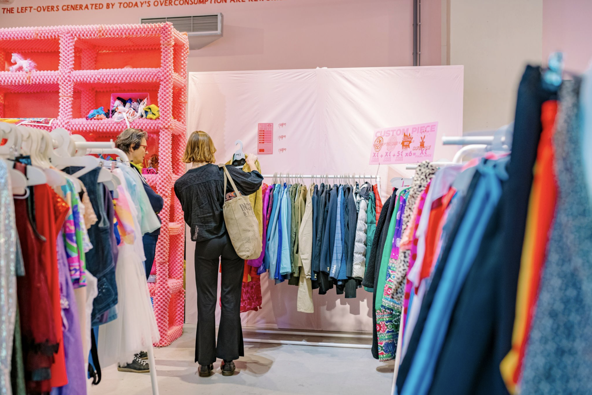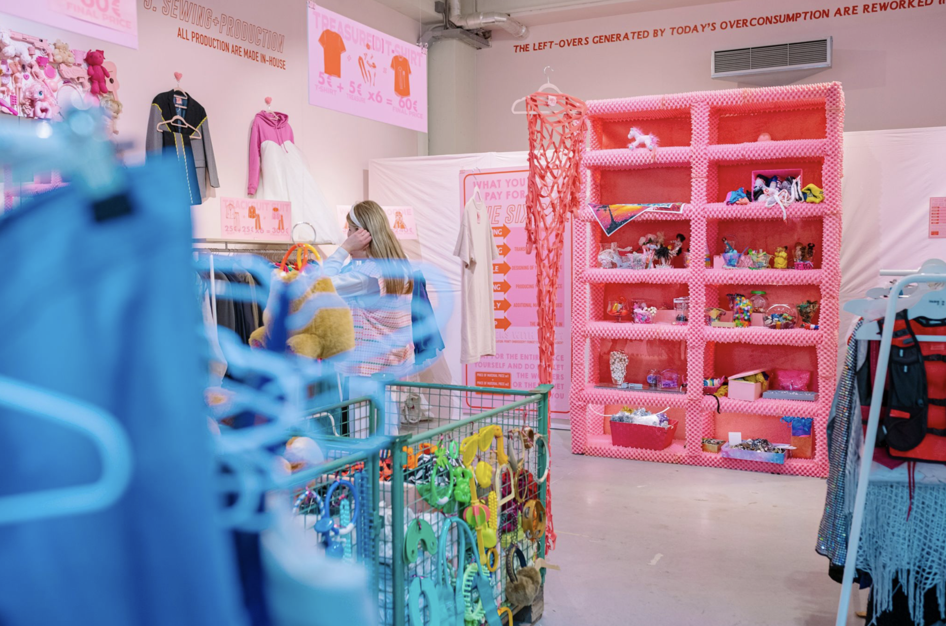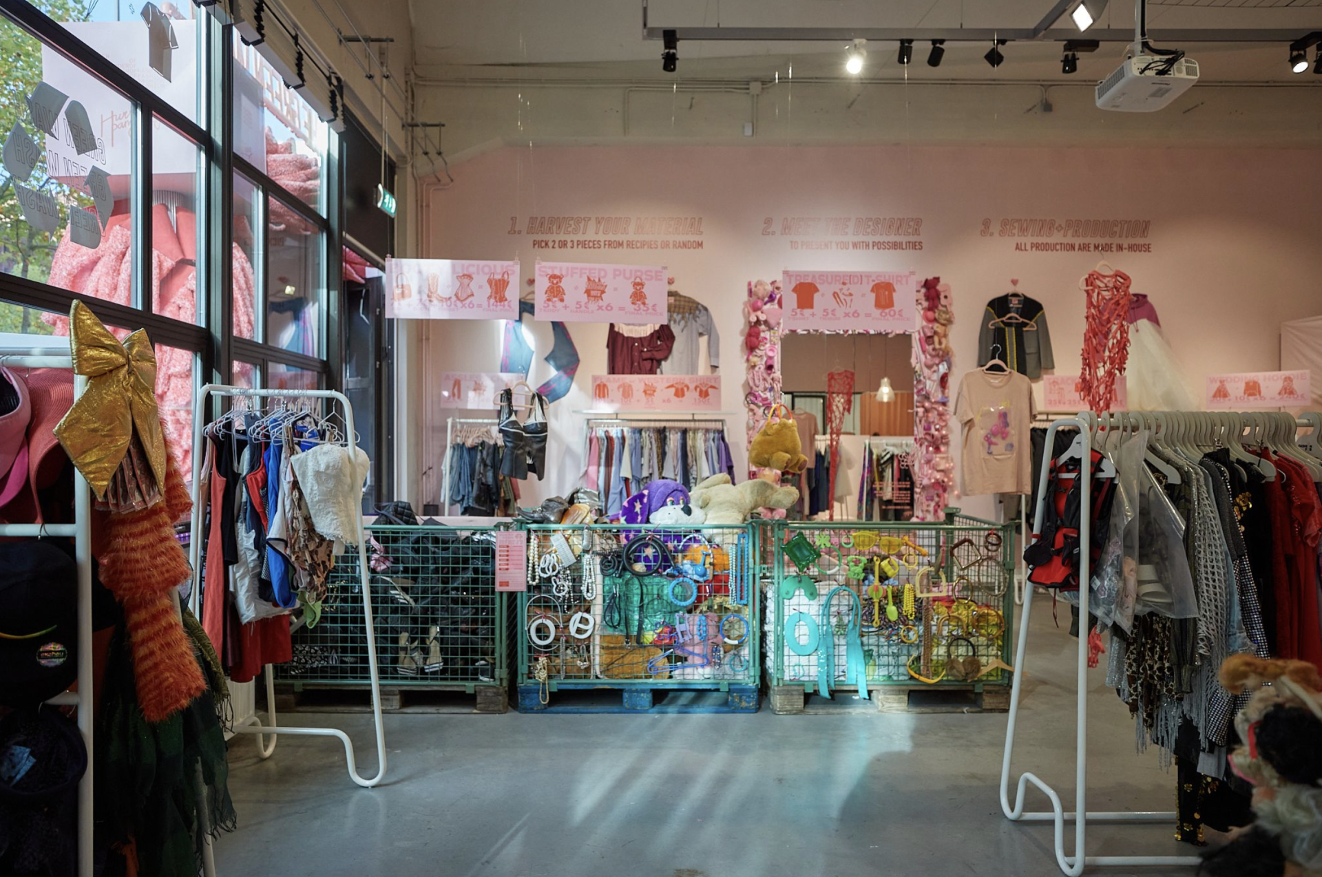 When presenting surplus and unmarketable products back to the consumer to be used as raw material - good curation and shop interior is of the utmost importance. The GREEN WASH provided a cheerful, fresh and bright experience within the boutique decor. Compared to your local second hand shop the visual merchandise is vivid, inviting and speaks about fashion possibilities rather than cheap finds. Feelings such as belonging, possibilities and candy shop were visual throughout the color coordinated materials.