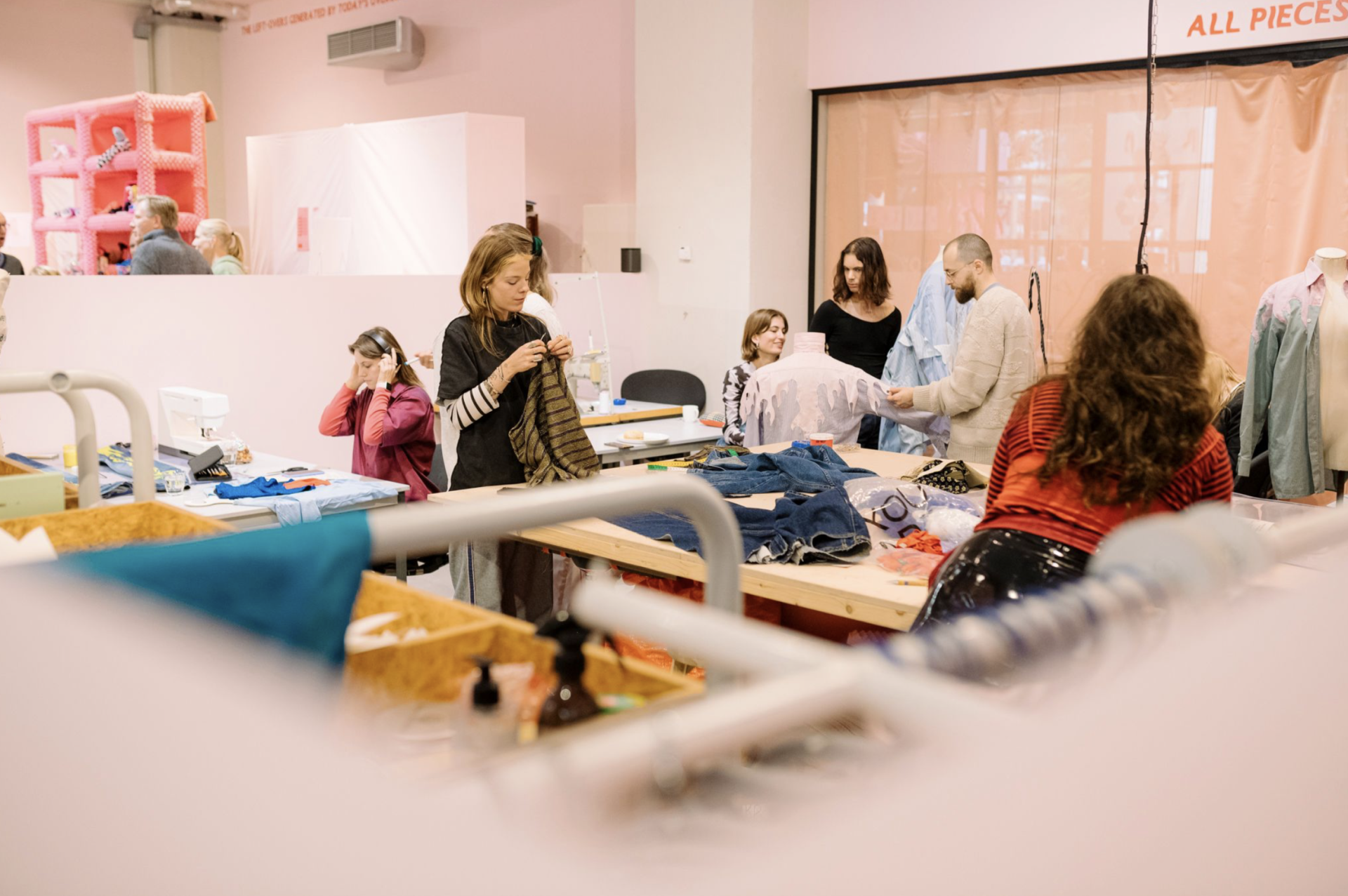 When happy with the result the pieces were sent into The SWEAT SHOP for production. At this visible atelier, our team of skilled sewers and tailors produced the custom pieces in full view to fully portray the labor and skills needed behind your new-from-old showpiece of fashion.