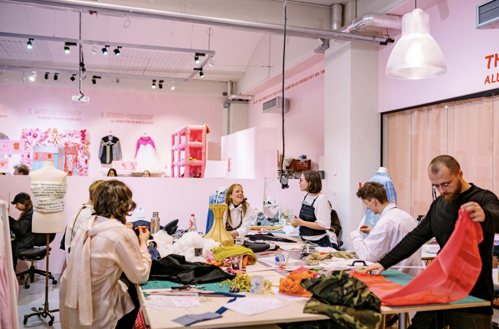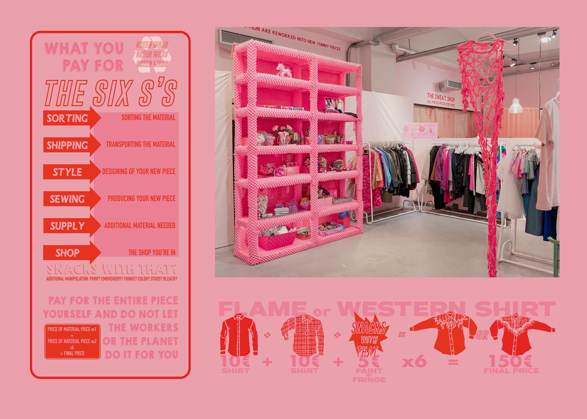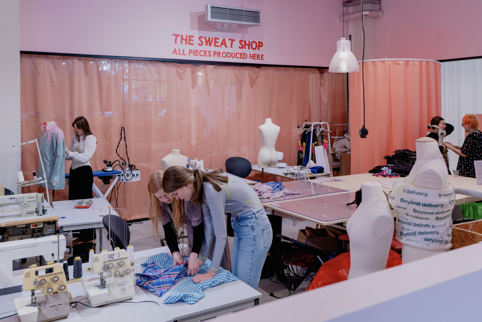 The customers were given real faces for everyone involved in the finished piece. Since The SWEAT SHOP is in full view throughout the event, good & healthy work conditions are demonstrated. Shopping as an experience no longer has to circle only around the 'quick rush' of purchasing new items but around participation, education, and most important: spending time, value and care. The shopping experience here is about the social - it is a safe haven and community where everyone is equally included and involved.