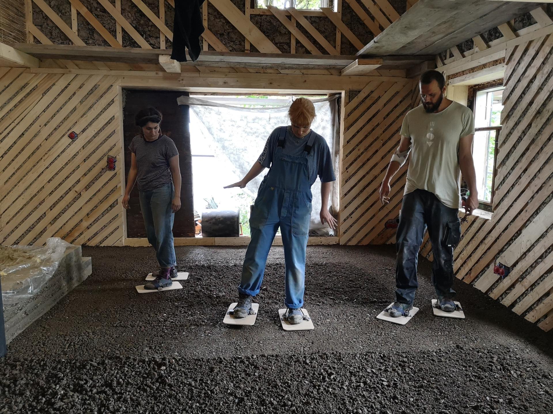 The doors of the Haegi Wendls house were always open during the construction phase. People passing by were curious to find out, what was going on at that unconventional construction site. They could find out why students were plastering with earth, where the wooden-chips insulation material came from and how a truss-lime floor is made. This was a great way of spreading the word about the possibilities of building with regenerative materials.