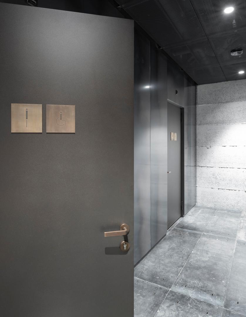 >Adapted toilets, with handrails integrated with countertops, paging systems, induction loops for the hearing impaired, ergonomic edge finishes, functional door handles, adequate light intensity without glare, patterns etched on glass for the visually impaired, no terrain barriers - smooth transition of the surface, bilingual information panels and signatures in Braille, indoor and outdoor seating, intercoms and light switches at adjusted heights.
