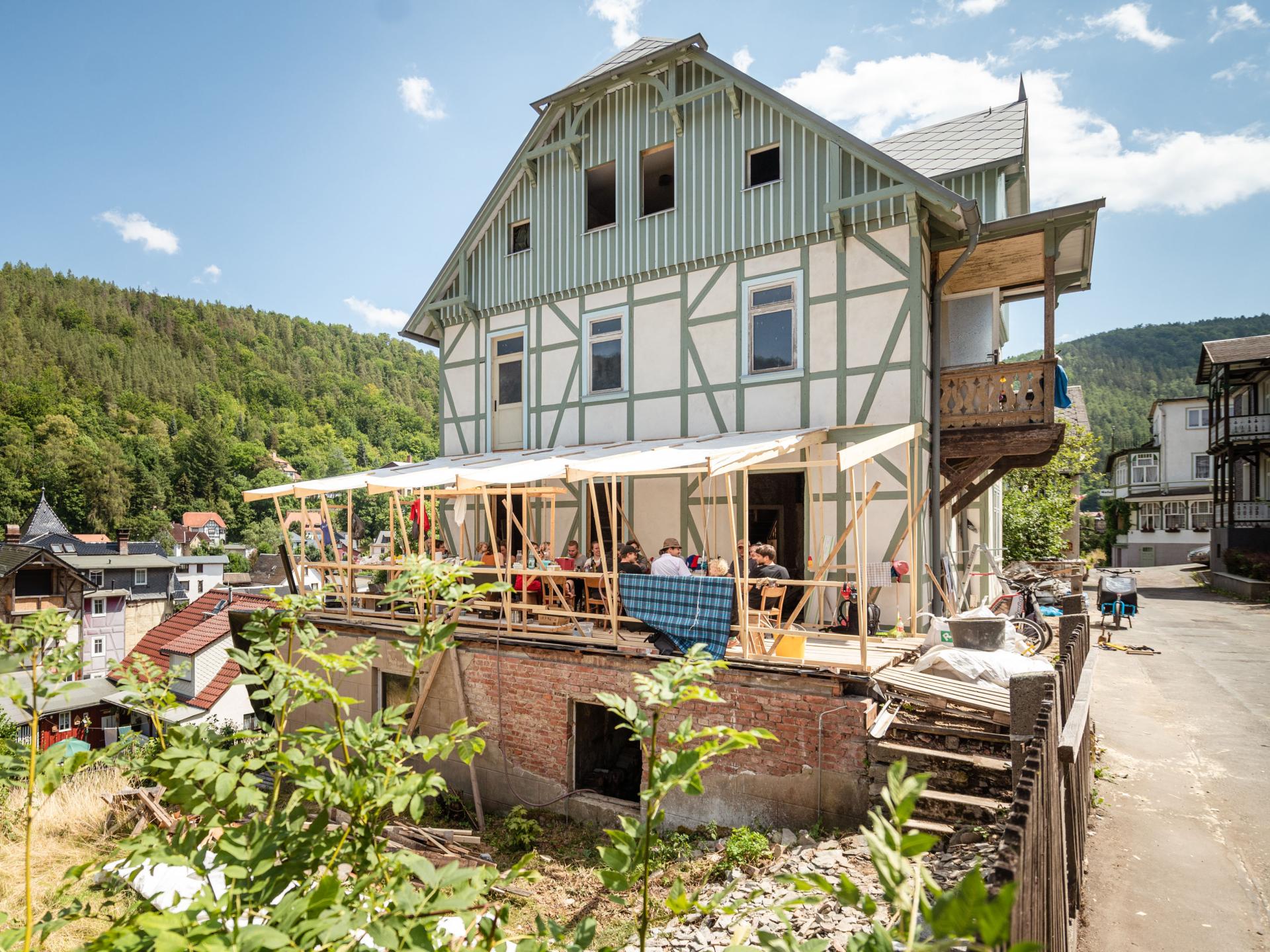 Like many rural regions in Europe and the world, the Schwarzatal region is affected by demographic change and economic downturn. Infrastructure and services for the public have been dwindling and an increasing number of houses stand empty. Haus Bräutigam exemplifies the urgent questions of a sustainable future associated with extensive vacancies: What does a sustainable conversion look like? What social and material or economic cycles can guide repurposing strategies? How can vacancies be established as places with a "sense of belonging"? And how can they function for the common good?