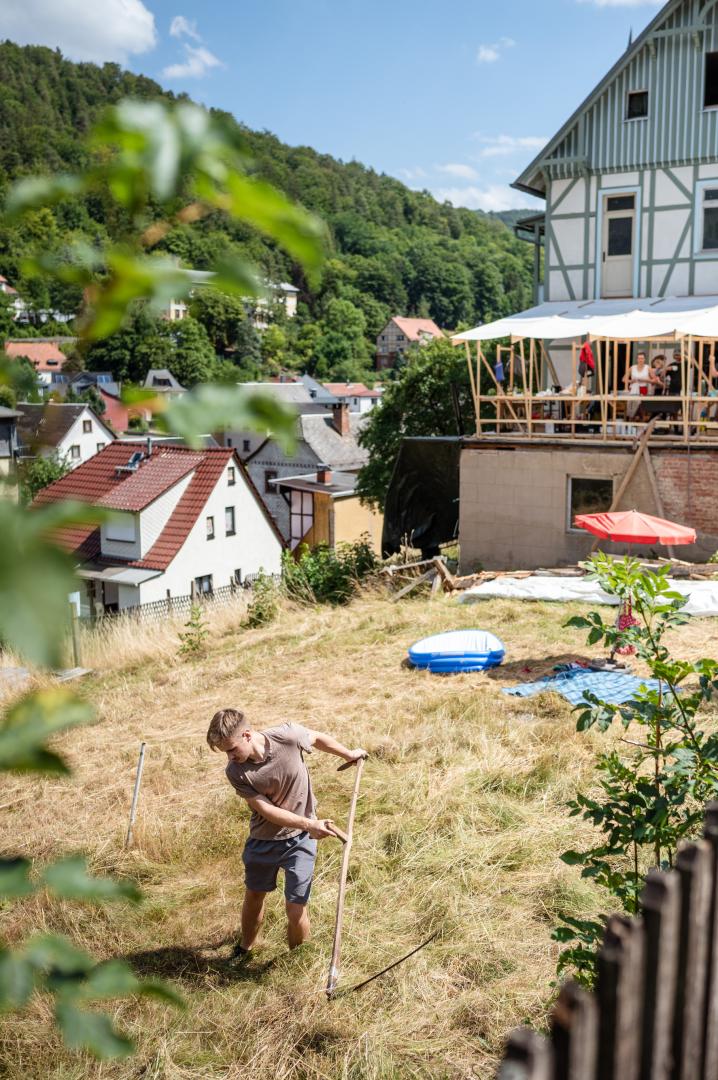 Learning with local stakeholders: At the local level, exchange and cooperation with actors and projects such as the Haus Döschnitz association is sought through various formats. For example, in the summer of 2023, a cooperative residency, "Festival of Local Heroes", takes place for the first time at two locations in the valley.
