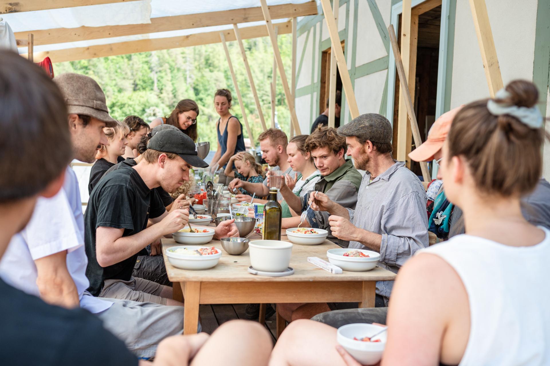 Togetherness: Shared meals at the long table integrates the most diverse people and promotes positive emotions. Whether it is the “Offene Baustelle” or the “Bauschule”, an important part of Haus Bräutigam identity, are shared meals in the garden or at tables in and around the house, dedicately fostering a sense of belonging.