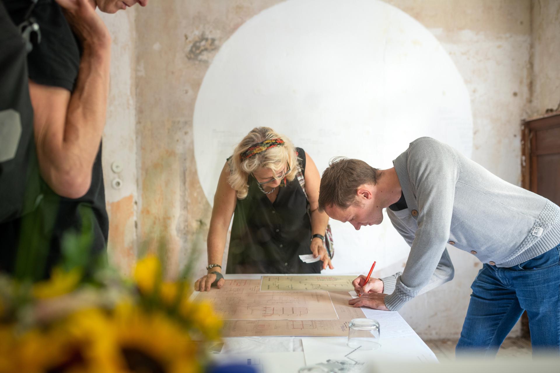 The initiative is being implemented in three stages, the first two of which are already being successfully carried out. In 2021, we introduced our low-threshold ‘Offene Baustelle’ format (open construction site), which has been held regularly ever since. Also in 2021, the first organized “Bauschule” (building school) took place, which included a ten-day learning stay at Haus Bräutigam, was once again repeated in 2022 and is in the planning for 2023. The third stage is represented by the “Fellowship Haus Bräutigam", which will be awarded for the first time in 2023. Here, individual artistic practice and research on site is accompanied by a mentor over a longer period of time.