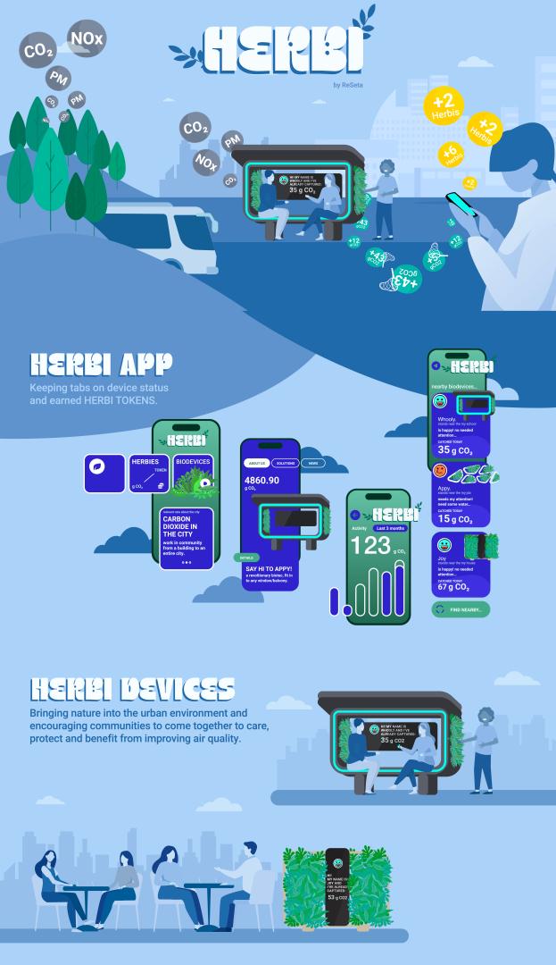 Our biodevices Herbi are cyber-physical products that enhance local carbon sequestration and air pollutants removal, quantifying and communicating to citizens the amount of captured CO2e. This value is tokenised and converted into a tradable environmental asset, benefiting local communities (1 token = 1 herbi). The whole system creates an emotional relationship between people and nature through technology, contributing to net-zero, nature-positive and healthy cities.