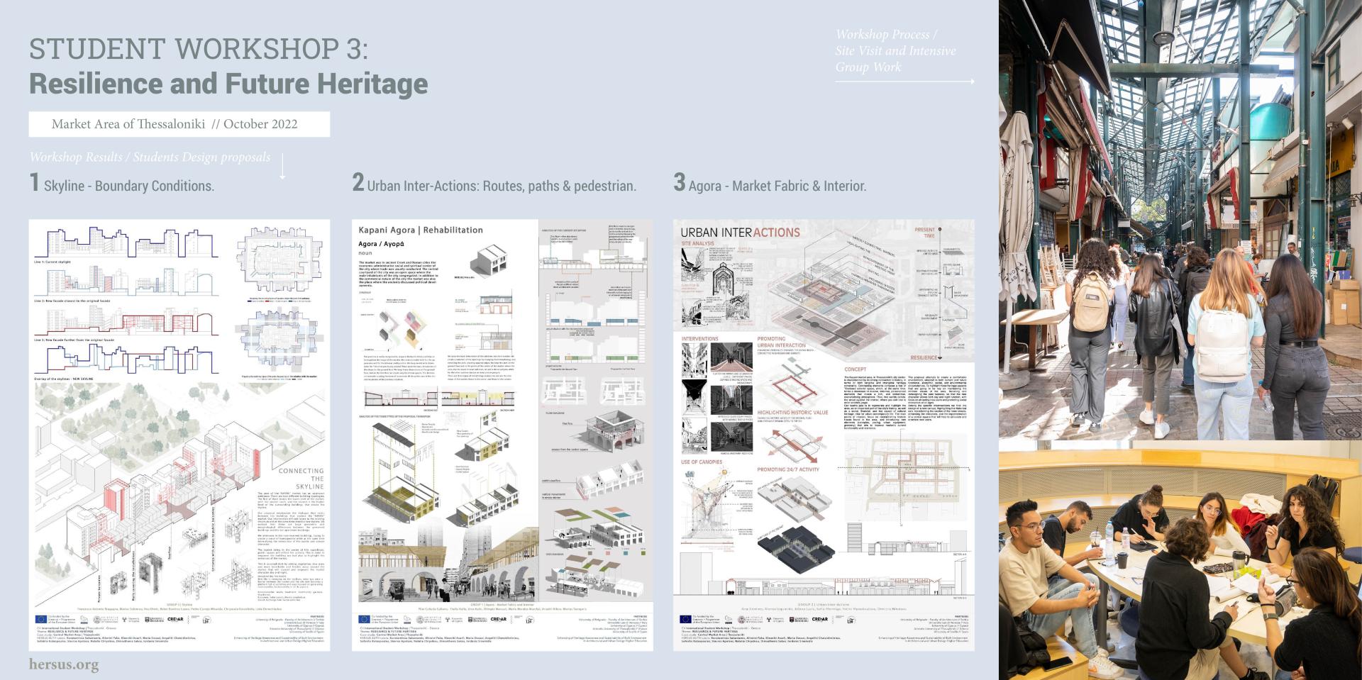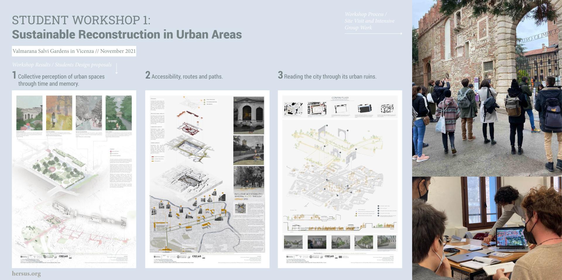 The notion of aesthetics and quality of experience for people is considered from a research-by-design perspective in the field of architecture and urbanism. The key objectives of HERSUS in terms of aesthetics and quality of experience for people are to (1) initiate small-scale initiatives in a form of student workshops directed towards generating conceptual designs for heritage areas and buildings, (2) reach out to local areas through place-based approach and stimulate students to critical thinking and problem-based research about the urban challenges related to heritage preservation, and (3) stimulate the implementation of the multiscale approach for research and (re)design of built heritage. In this context, HERSUS Consortium implemented three student workshops: (1) Workshop 1: Sustainable Reconstruction in Urban Areas (Venice, Italy - 22nd–26th November 2021 (onsite)) - The engaged study field was the Valmarana Salvi Gardens in Vicenza. The primary purpose was to understand how historical gardens could influence contemporary communities and designers and to re-think them through contemporary standpoints; (2) Workshop 2: Adaptive Reuse (Nicosia, Cyprus - 2nd–6th May 2022 (onsite)) - The engaged study field was the walled city of Nicosia. The intention was to provide a holistic view of the area and to develop a different attitude toward cultural heritage and sustainability focusing on the adaptive reuse of vernacular dwellings, semi-open and open spaces; and (3) Workshop 3: Resilience and Future Heritage (Thessaloniki, Greece - 17th–21st October 2022 (onsite)) - The engaged study field was the Market Area of Thessaloniki (Kapani Market). The international team's proposals focused on occupancy and land use, the environmental performance of the urban fabric surrounding the markets, and the future restoration and upgrade of the market building stock.