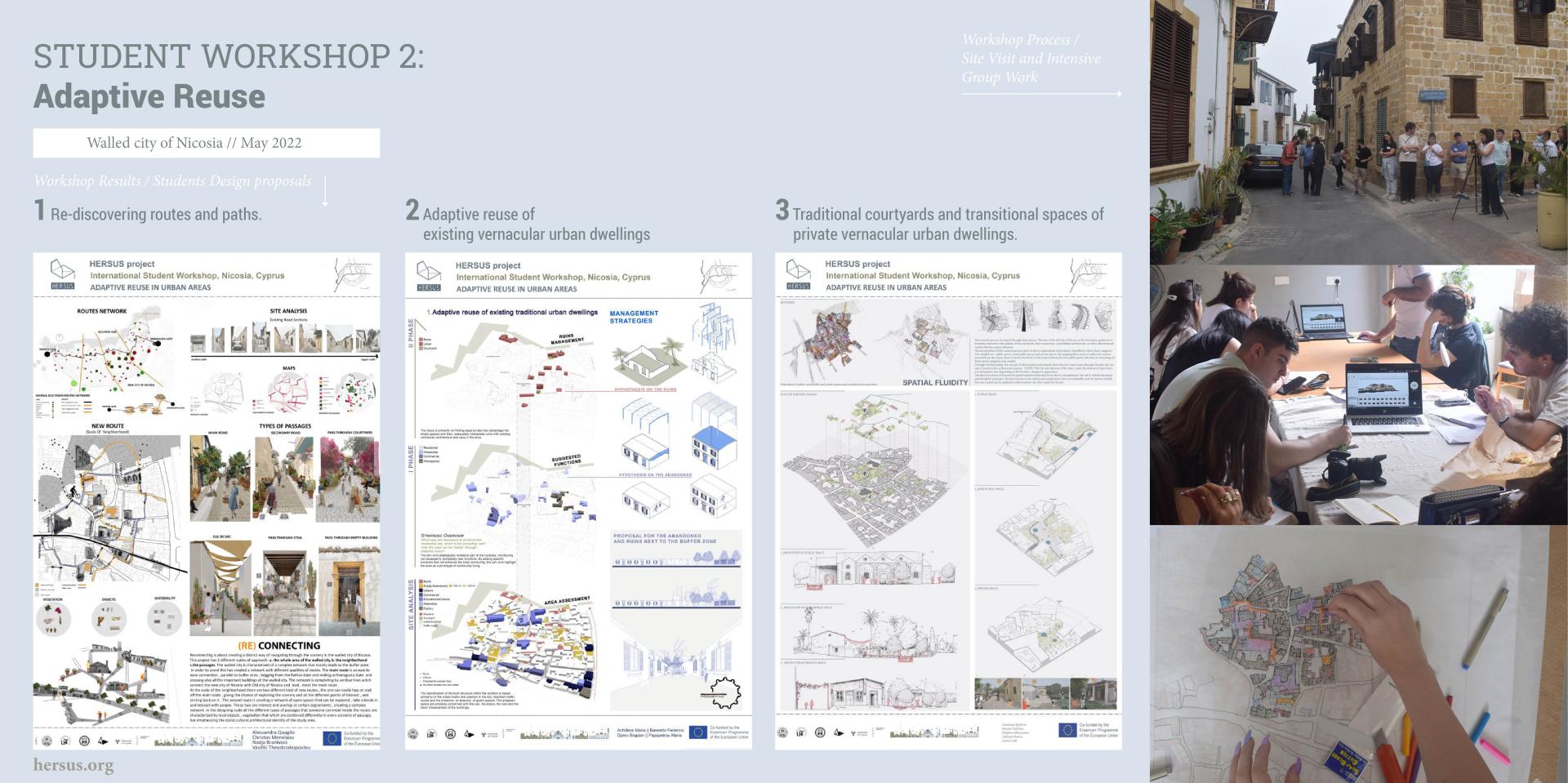The HERSUS starts from the recognition that the practice and education in the field of architectural and urban design related to awareness raising about the sustainability of the built environment and heritage face numerous challenges such as social transformation, climate change, globalization, urbanization, and housing issues. On these grounds, HERSUS recognizes the necessity of introducing new regenerative design strategies that could contribute to the sustainable transformation of the built environment and the preservation of heritage, and pilots them through the syllabuses of student workshops in the following way: (1) Workshop 1: Sustainable Reconstruction in Urban Areas dealt with cultural heritage and sustainability themes through the points of identification and testing the local practices of sustainable reconstruction; mitigation the impacts of climate change and natural hazards on cultural heritage by strengthening the resilience of sites and communities and promoting the sustainable reconstruction of urban areas; and development of an innovative, collaborative and systematic approach to promote effective regeneration and adaptive re-use in the historical area. (2) Workshop 2: Adaptive Reuse dealt with the adaptive reuse of existing vernacular urban dwellings within the divided walled city of Nicosia as a place of culture and memory; intangible and tangibles values as a tool for multidisciplinary reading and revival proposals of the divided walled city of Nicosia; re-discovering routes and paths through the design of cultural network and interconnections; and (3) Workshop 3: Resilience and Future Heritage entailed an elaboration on the evolution of urban heritage in the establishment of a multifaceted heritage site, where modern heritage is striving for attention within an area densely occupied by historic monuments, whereby tangible and intangible heritage are equally important for the preservation of cultural identity.