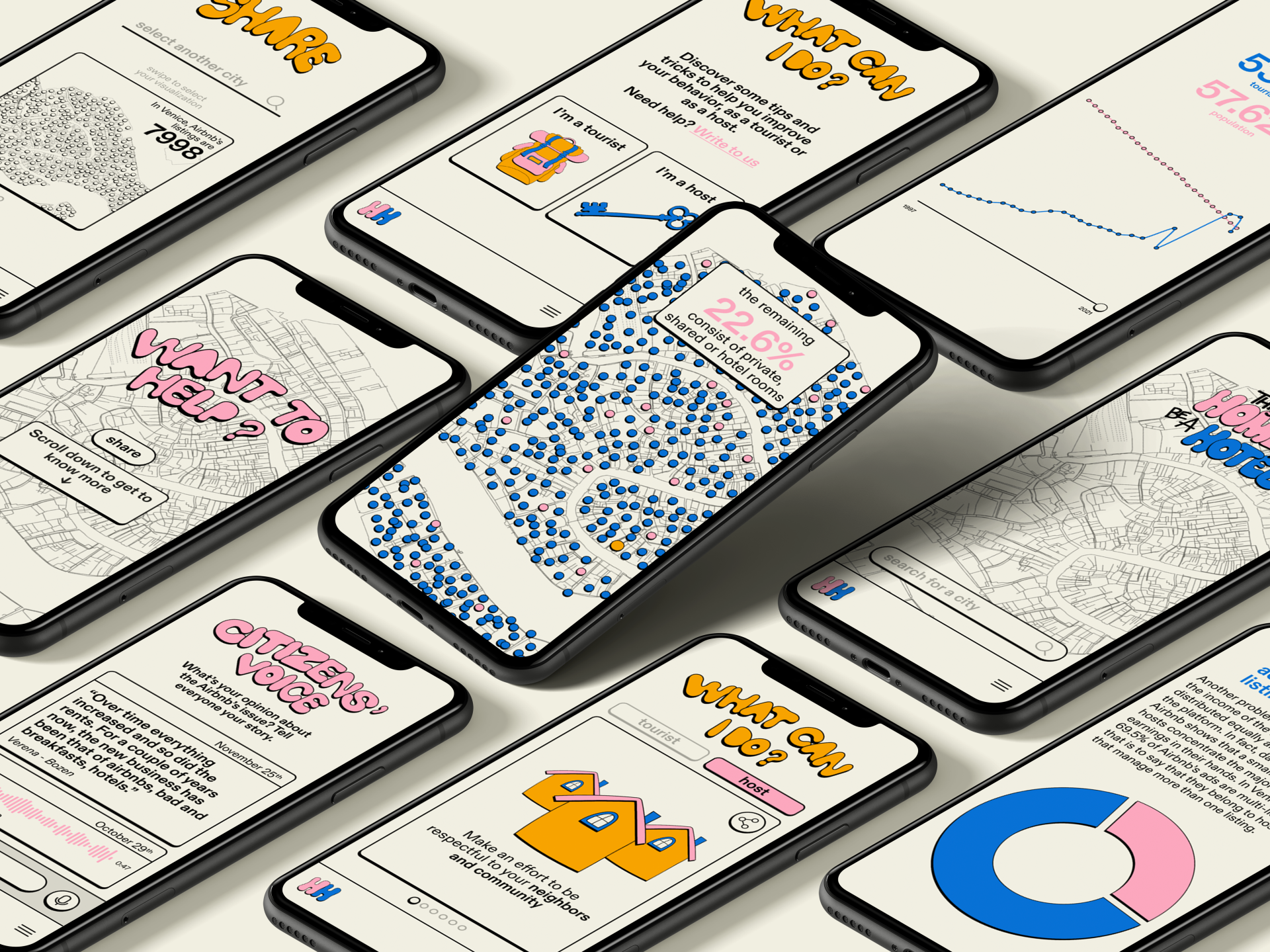 This Home should not be a Hotel is an informative and activist experience that aims to raise awareness of the effects Airbnb has on cities. People who gravitate around Airbnb, such as tourists, citizens, and hosts, are the main users. The experience is guided by situated storytelling that presents data from Inside Airbnb, a platform that collects all Airbnb data. It's also an open-source tool that helps activism groups in sharing Airbnb data in an engaging way.