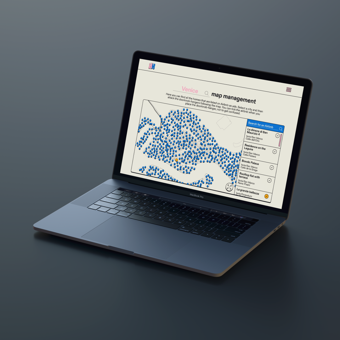 "This Home should not be a Hotel" is an informative and activist experience that aims to raise awareness of the adverse effects Airbnb has on cities, such as gentrification, displacement, and inequalities. It has two main touchpoints: a web platform dedicated to activistm groups and a web app dedicated to Airbnb users (guests, hosts and also citizens). The web app's goal is to inform people through data provided by Inside Airbnb, a platform that over the years has collected all Airbnb data (number of listings by city, number of hosts, average nights of rental, average earnings) in a database. The users access a web app through the scan of a QR code on doorknob hangers that are placed on the handles of Airbnbs. Thanks to geolocation, they can see some "stories" displaying how the problem is affecting the place where they are. These stories tell the problem presenting data through an interactive map. Users can then decide to take various actions: donate money to support the project, share customized visualizations, share a thought with other users to create a dialogue, or dive deep into the subject.
