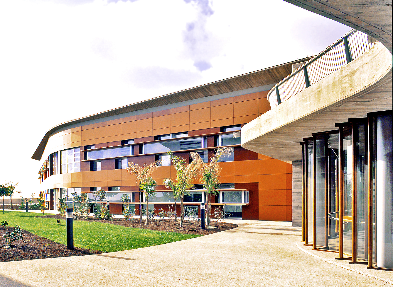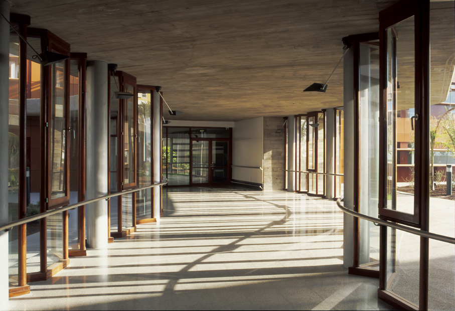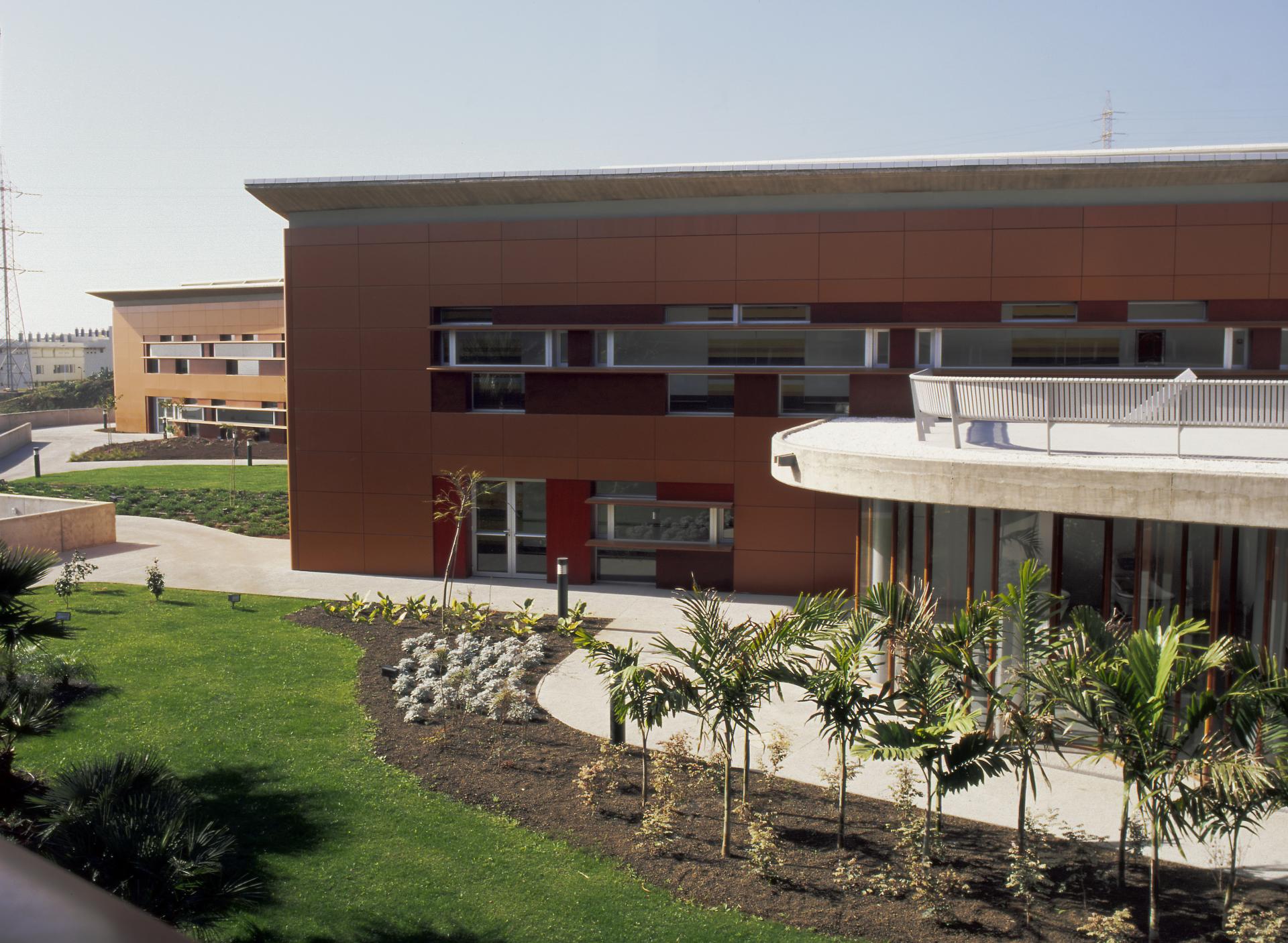 The formal arrangement of the hospital voluntarily avoids orthogonal geometry, considering it to adapt poorly to the plot topography and to generate very static and rigid spaces. The reduced mobility of potential users together with their sensorial and mental disabilities and the fact that their lives will unfold completely within the Centre, recommended a building type capable of performing the duties of home, neighbourhood and park all together. In consequence, the complex, more than being a building is the sum of several buildings, linked together by means of a glazed curvilinear street overlooking the landscaped courtyards to the north and the gardens to the south. Curvilinear geometry is used to achieve a friendly and comfortable environment, avoiding corners to facilitate movement of people with limited mobility.