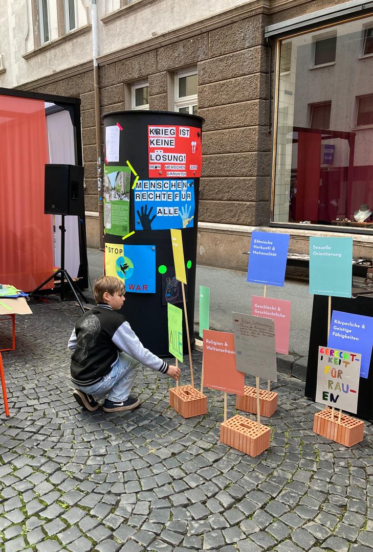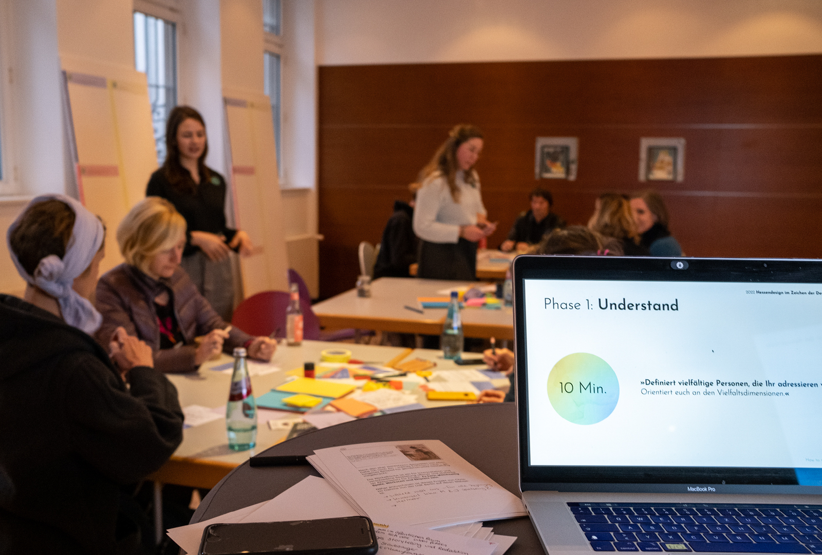 The workshop concept of "How to: gerecht gestalten?!" is particularly characterised by its scalability and adaptability. It has taken shape over the last year. Over time, different target and interest groups have been involved. The workshops, which were adapted to the context, always included a feedback round, through which the "How to: gerecht gestalten?!" team reflected and learned important lessons for the future and gained important learnings for subsequent workshops. The first workshop on the occasion of the Diversity Day took place with students and professors from a design college. Professional exchange took place in open discussion and group tasks. During the "Road-Show" at the Design for Democracy Tour, the profile of "How to: gerecht gestalten?!" was expanded to include the component of democracy. The workshops took place both with pupils in a school and with the general public at the democracy van of the Road-Show. Here, justice in design was conveyed as a tool for living democracy and the sense of belonging to democratic processes was promoted and strengthened. As part of the "AGORA" event in the series "Hessen Design im Zeichen der Demokratie", the workshop was also held for the first time with designers from various fields. The group of participants consisted of architects, industrial designers and communication designers. After the workshop, parts of the group continue to exchange information bilaterally on theoretical content and events. The aim of the regional platform is to raise this exchange to an accessible network level.