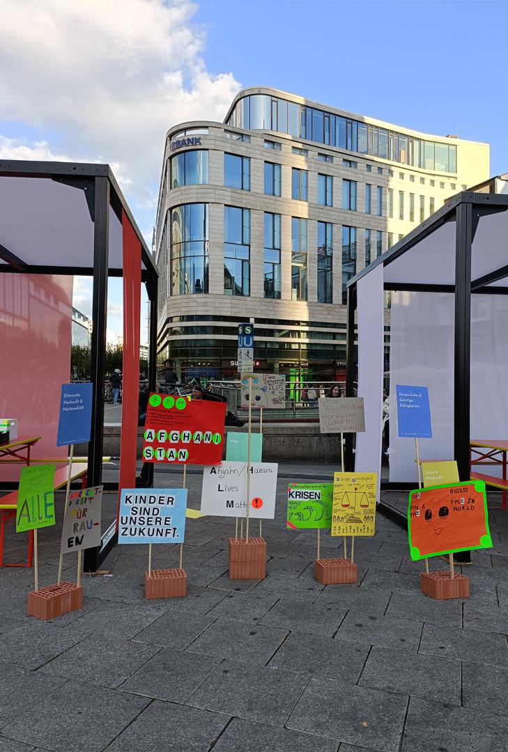 If designed products are aesthetically pleasing, we like to surround ourselves with them. If they also function well and offer a high quality of experience, all the better. Whether a product "works well" depends on how smoothly the interaction between the product and the users is in the specific context of use. Many products and services in our everyday life are designed for a specific target group, potentially neglecting marginalised groups - offering a quality of experience only for certain people. The workshops encourage participants to question the existing, include pluralistic perspectives and develop a shared creative vision. Diversity is a key characteristic of the target group: a growing diverse society needs environments that reflect this. Therefore, we need to see diversity not as a limiting factor, but as a gain: when exclusive solutions are replaced by inclusive ones, there is an advantage not only for the previously excluded. According to the principles of universal design, everyone benefits. "How to: gerecht gestalten?!" expands the concept of aesthetics to include a social component: What is inclusive is particularly beautiful because it creates a sense of belonging instead of exclusion. Aesthetic potential thus reveals itself when one deals with issues of justice, inclusion and belonging. Concrete ideas have already been developed in the first workshops. In the different contexts, participants were brought to awareness of the aesthetic potential of inclusive design. Participants of different age groups were able to understand and absorb this. On the occasion of the application of the city Frankfurt am Main as World Design Capital, the associated topic "Design for Democracy" also became the focus of the workshops. Students developed protest posters in which they spoke out against current social injustices and inequality. In a design sprint with a group of designers, initial concepts were developed on how everyday products could be made more inclusive.