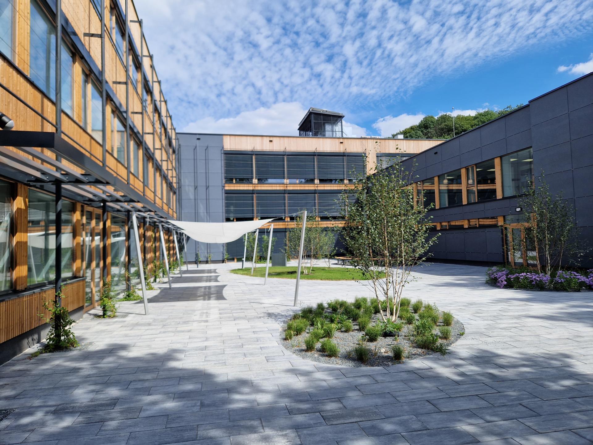 -In addition, the entrance floor offers a direct connection to the atrium from the lobby, as well as the school cafeteria and the student coffee bar. Large fabric shade sails provide shade during the summer months, and mature trees will offer shade in the future. The atrium further transitions into various outdoor spaces used for both alternative outdoor learning and active student recreation.