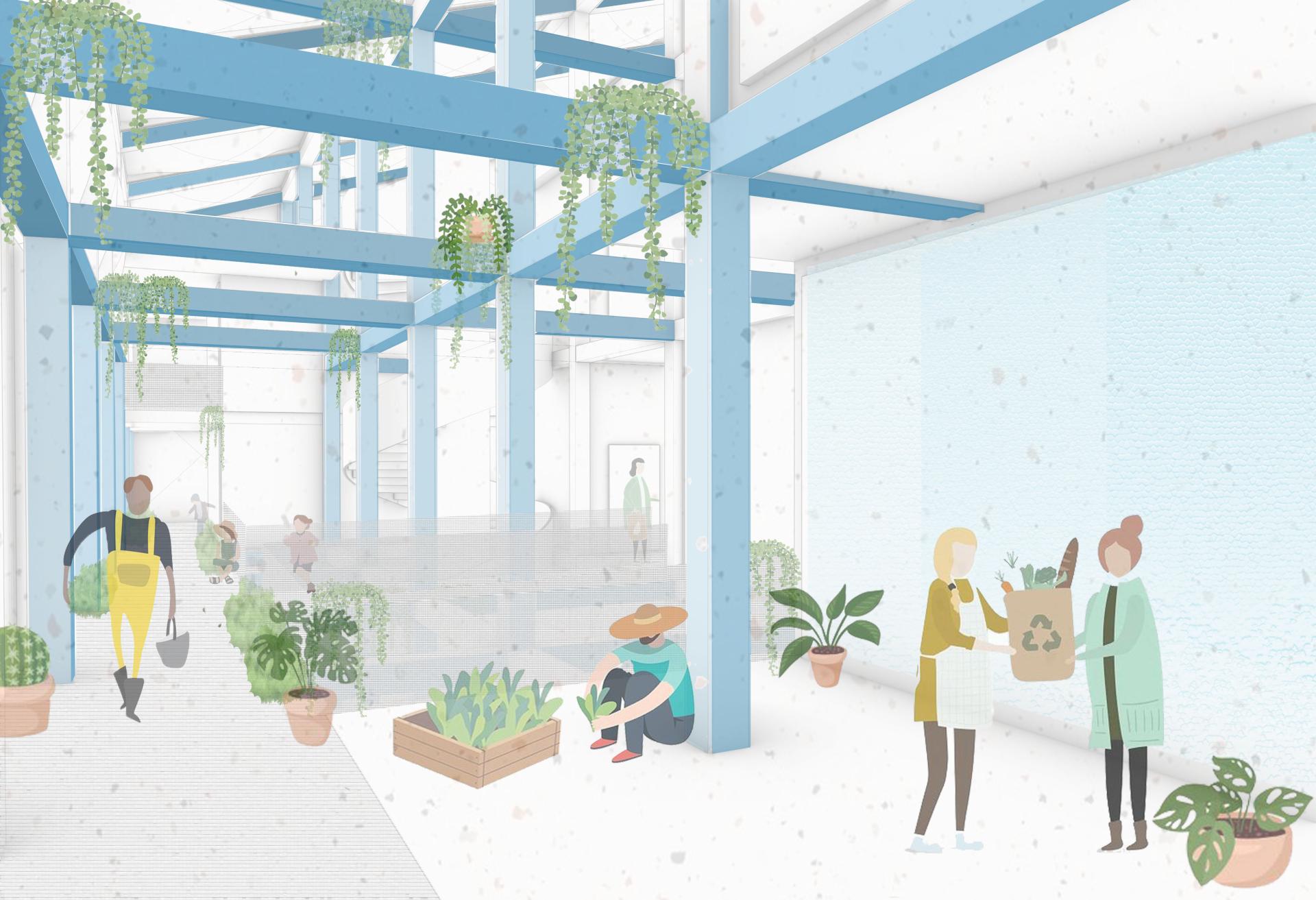 As elements of my project that can be transferred, it can only be that at least a composter can be applied to every inner block in the city and start to help the planet a little at least in such a simple form. As another element, the choice of materials chosen in the design can be, for example, the etfe foil used on the facade of the greenhouse, which has amazing properties but is not often used nowadays. In terms of energy consumption, the structure of the building is based on the principle of one structure within another. The main functions of the building take place in isolated boxes, and around them there are communication spaces and terraces suitable for planting and growing plants.