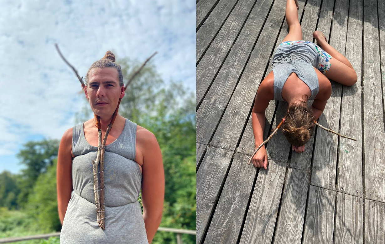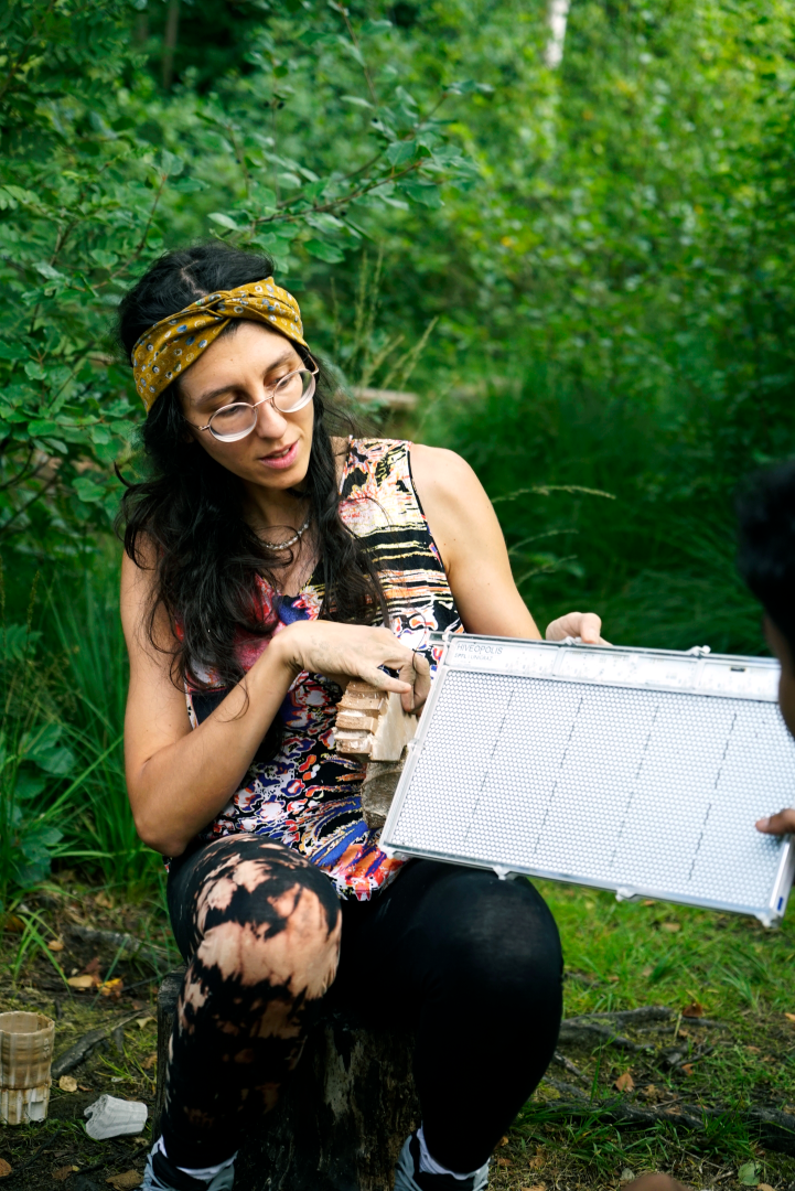 We approached insects by focusing on our human capacities to sense, perceive, and imagine; they didn’t necessarily play an active part. Methods, such as Embodied Ideation [1] let us feel, express, and imagine ourselves as another by e.g. making insect-inspired costumes and exploring them on a “perception walk”. Primal Play, an embodied relational practice in which humans meet through movement, breath and sound, brought us closer to communicating beyond words. A blindfolded forest exploration brought us close to non-visual experiences, fermented leftovers to our sense of taste, and observations with magnifying tools into the scale of insects. We hence approached insects from a “liminal intimacy” and chose to recognize and respect their autonomy by letting them be [2]. Post camp, insects have evolved to direct stakeholders. The installation is a physical meeting point, an intervention that fosters relationships with insects and their local ecosystem.