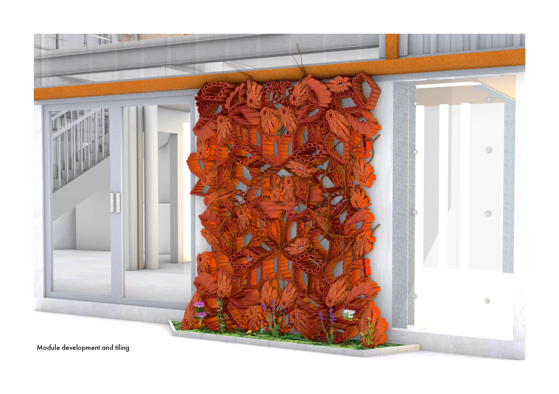 - the improvement of biodiversity: Man-made ecosystems risk biodiversity and cause potential problems by reducing the interaction between organisms. Interlacing multi-species keeps the ecosystems resilient. Our initiative questions how we, as designers/architects, can relate to other species and how our designs can sustain and support life. Therefore, we assembled a prototype wall that is designed to host organisms, especially insects, as an alternative to traditional building elements.