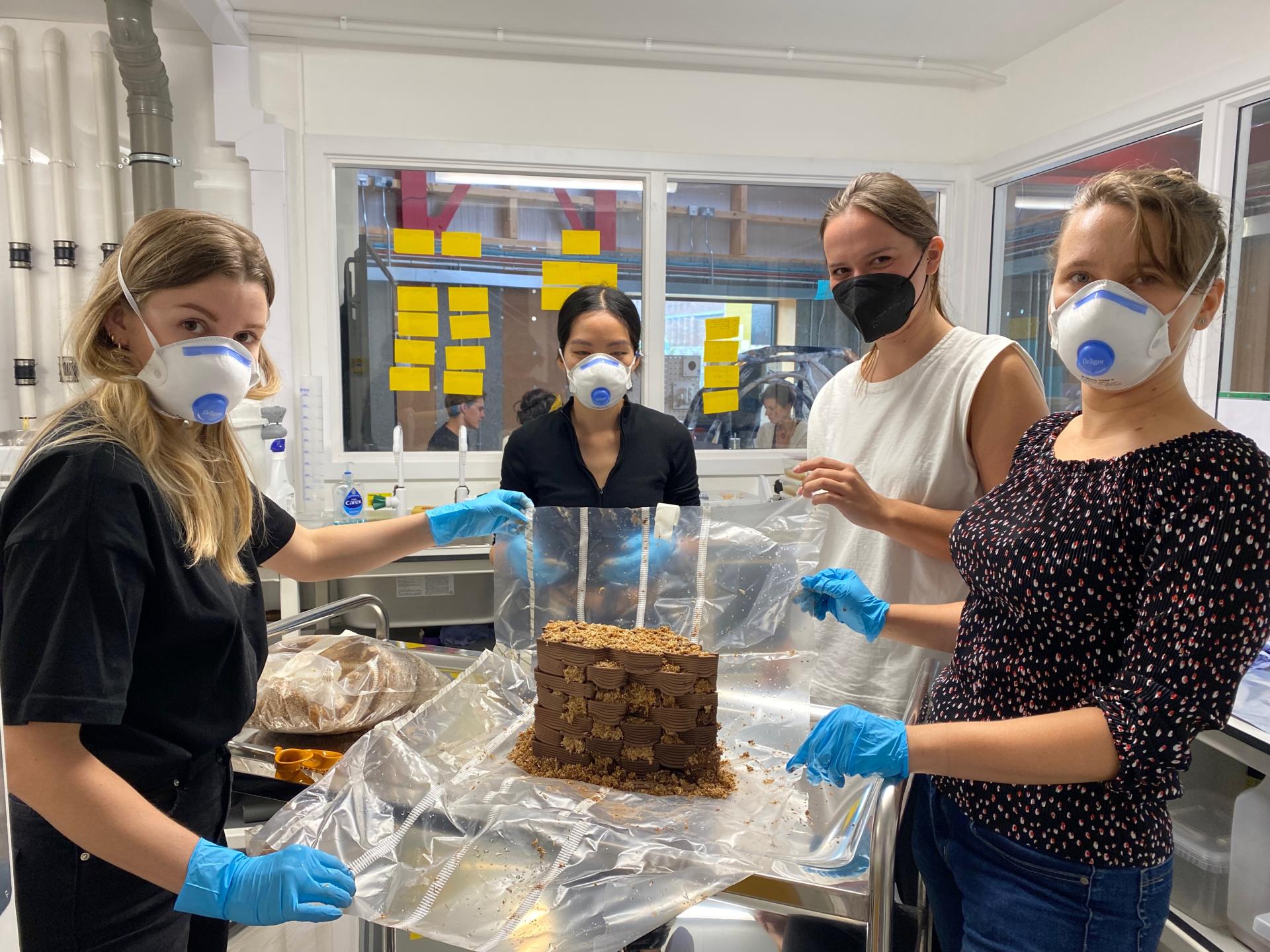 - 2 workshop organizers and 3 former participants work on a follow-up prototype. With architectural students, biologists from the Uni Graz, and an art collective in Graz, we're developing 3D clay-printed wall modules with mycelium composites for harboring native insects. Complementary, textile clay hybrids are being prepared for installation in Hvalsø.