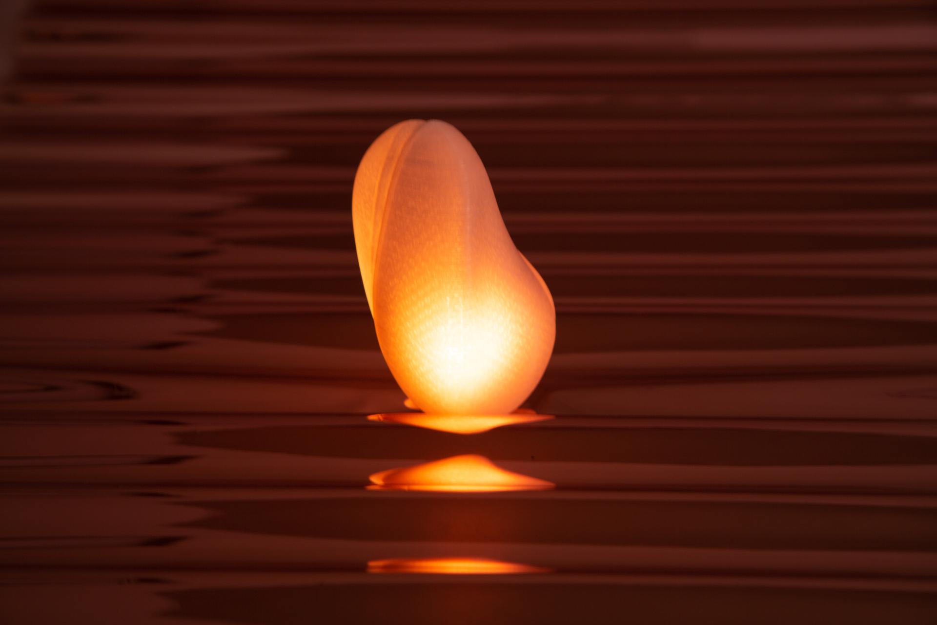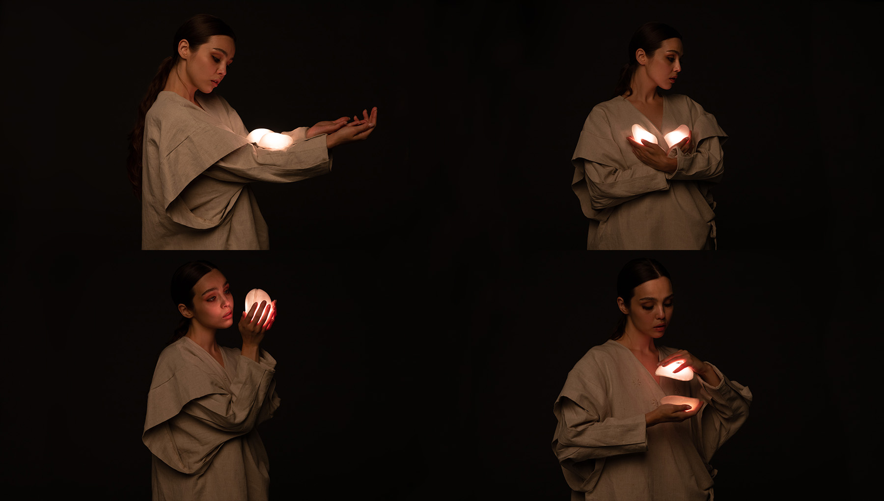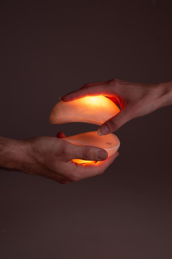 The object's form was designed to evoke positive emotions. The organic and ergonomic shape encourages exploration with the sense of touch, the two halves providing a substitute for a yearning hand craving closeness. The sister halves subtly encourage gradual sharing of their experiences, as they can operate both independently and in parallel. Communing with the object allows us to carve out the time needed in the process of transformation and reconciliation with loss. Light and breath are age-old symbols of presence appearing in most cultures and religious faiths. The user is able to enter into a relationship with the "IO", animating it, just as we naturally did as children with our toys. Use is aimed at developing the well-being of every sphere of life: body, mind, soul and emotions. The object is designed to be both a stand-alone light object that can accompany us at the table, on a desk or bedside table. It can function as an accessory, accompany us in everyday life, lowering our feeling