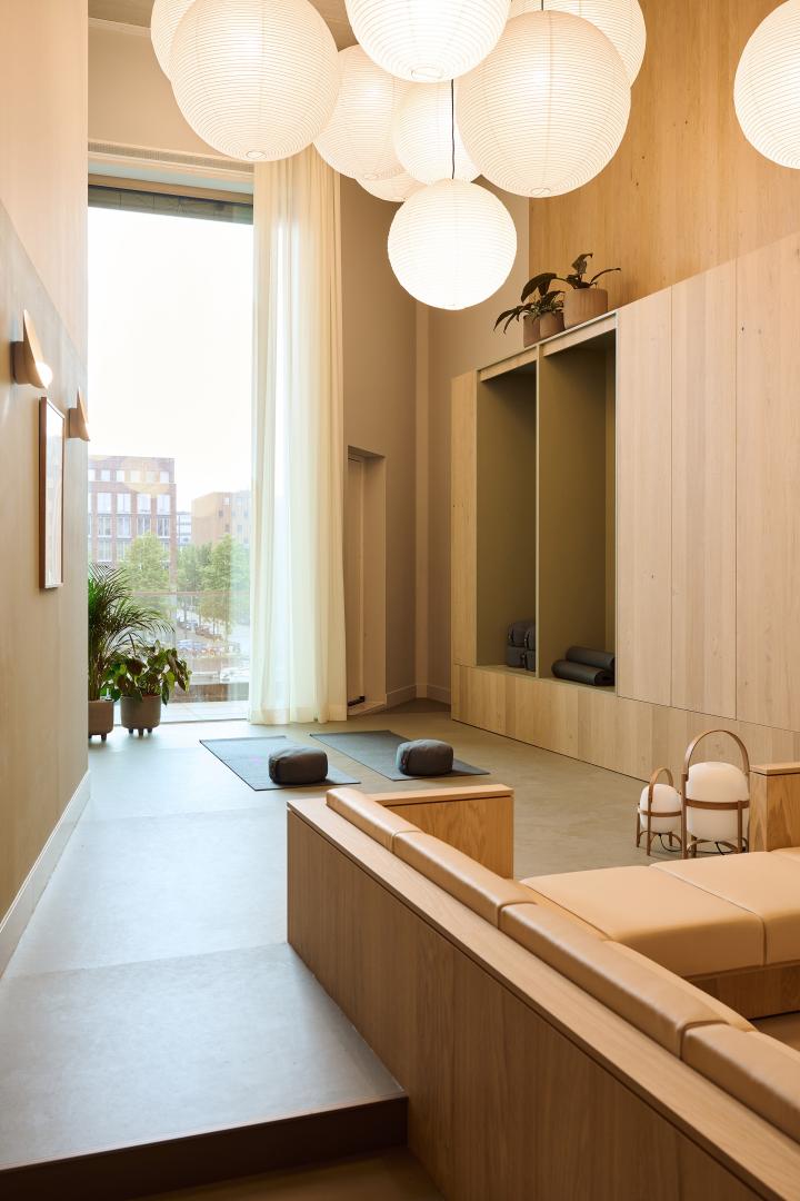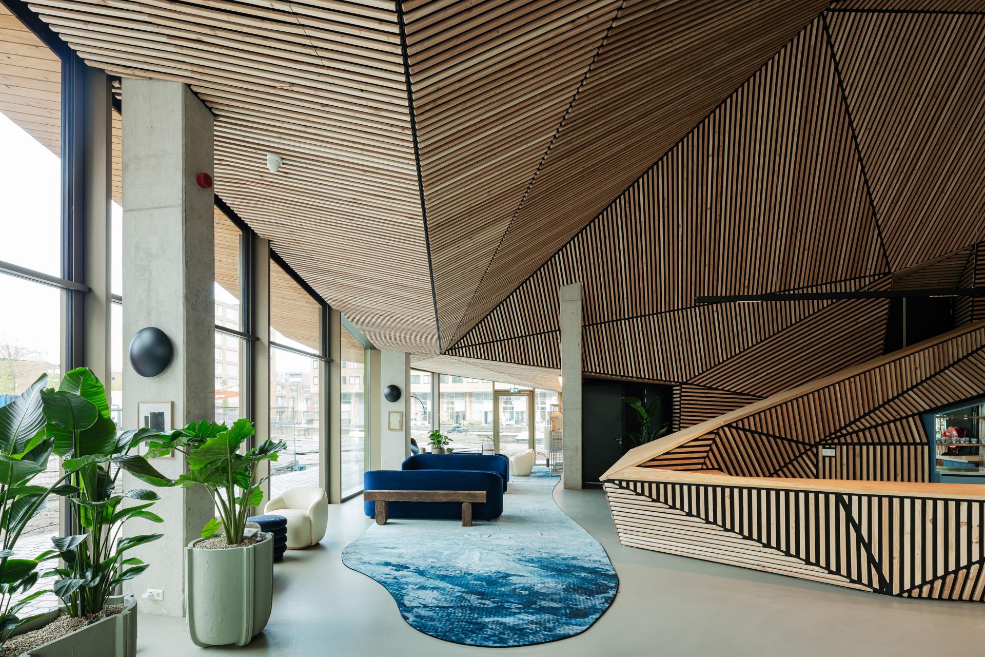 All mayor design decisions were based on supporting and strengthening the concept of Jonas. Together with its surroundings, the building forms a ‘living landscape’. At the front side, a public forecourt is bordered by a timber pavilion with steps, which act as a three-dimensional playground. The pavilion marks the entrance to the car park and serves as a tribune for all kinds of activities, such as a film screening or outdoor events. The green exterior, with trees providing shade, invites people to linger and – in the summer – there is even a city beach on the water’s edge. But the real surprise of Jonas awaits inside. The interior is welcoming, warm and spectacular. It expresses a modern and sustainable community life. A communal route, shaped as a canyon, extends through the building, linking together the public and collective program, including the living room, guestrooms, a yoga studio, the forest patio and the rooftop beach and bar. The commercial facilities in the plinth, all supporting the concept and bigger picture of Jonas, provide dynamism on the ground floor and the quay. A real heart for IJburg!