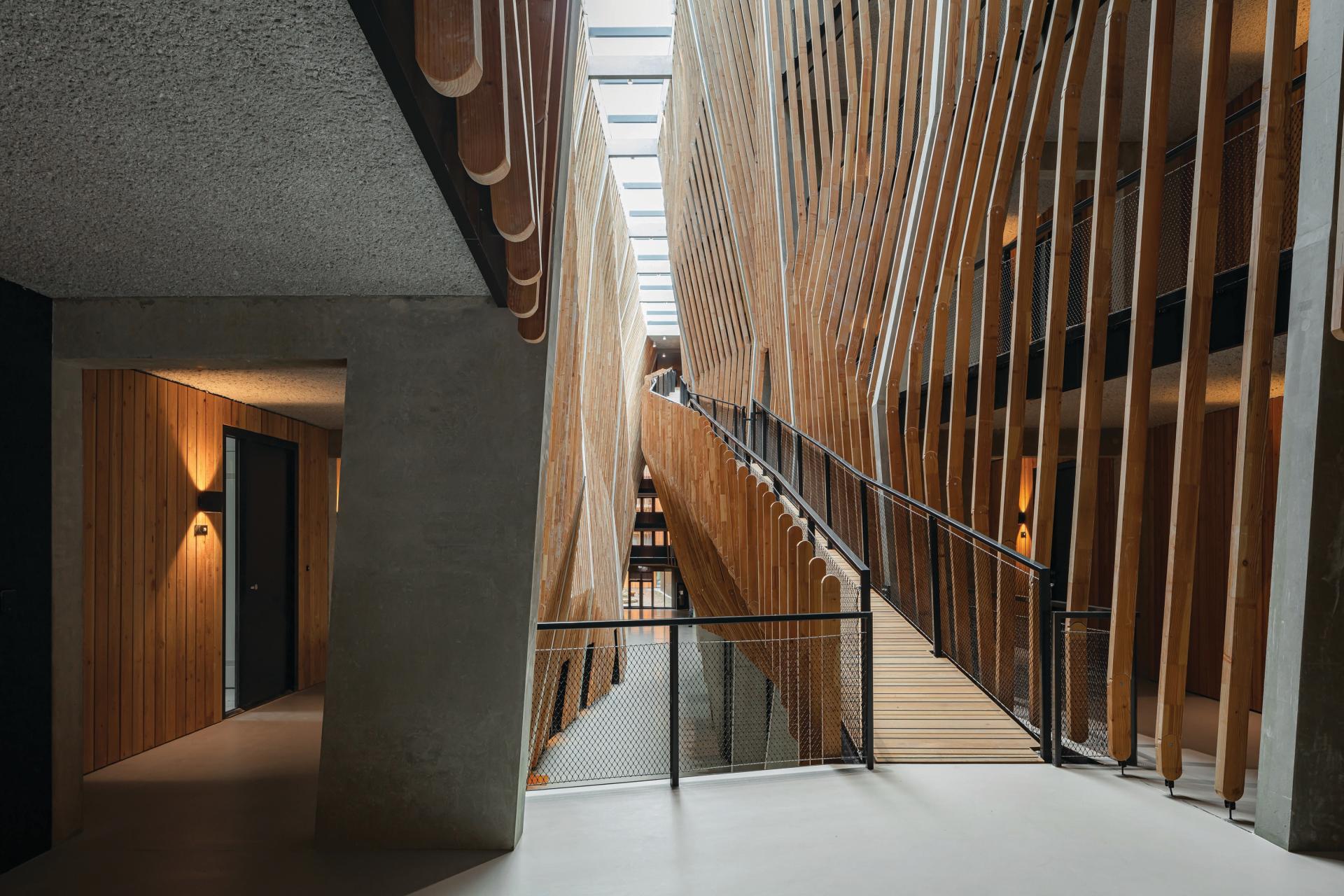 But the real surprise of Jonas awaits inside. This is welcoming, warm, collective and spectacular. It expresses a modern and sustainable community life. The interior is unexpected and surrealistic. The spatial concept is based on the way traditional wooden ships are constructed: a skeleton consisting of a series of trusses arranged in a row, which form the main structure. This allows large hollows to be carved out of the volume, and the required housing program is contained within the ‘skin’ of the building.